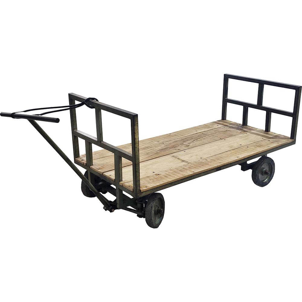 Vi kunne slet ikke stå for denne skønne markedsvogn, da vi fandt stellet i yarden i Indien. Vi blev dog nødt til at erstatte det originale mørnede træ med denne træbund i mangotræ. Med sit solide jernstel og den robuste træbund, kan den klare lidt af hvert. De kraftige hjul og det simple håndtag gør den nem at manøvrere, uanset om du bruger den til at flytte varer, eller som en unik displayvogn i din butik. Har du meget plads derhjemme, kan vognen fungere som en anderledes indretningsdetalje – perfekt som et rullende podie i haven eller som et sjovt opbevaringsmøbel i stuen. Uanset anvendelsen, tilføjer denne vogn et rustikt og industrielt touch til ethvert miljø.