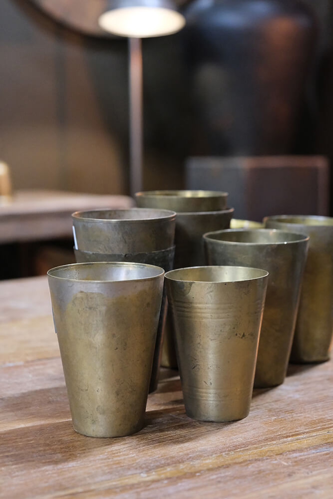 Skønne og dekorative gamle Lassi krusi messing, alle med en unik struktur. Navnet Lassi stammer fra en traditionel indisk yoghurtdrik. En blanding af yoghurt, vand, salt og forskellige krydderier, som eks. ingefær, kanel, muskat, chili eller koriander. Disse gamle krus er smukke til dekoration, opbevaring eller som vase. Giver lige lidt mere stemning, hvor end de bliver stillet.