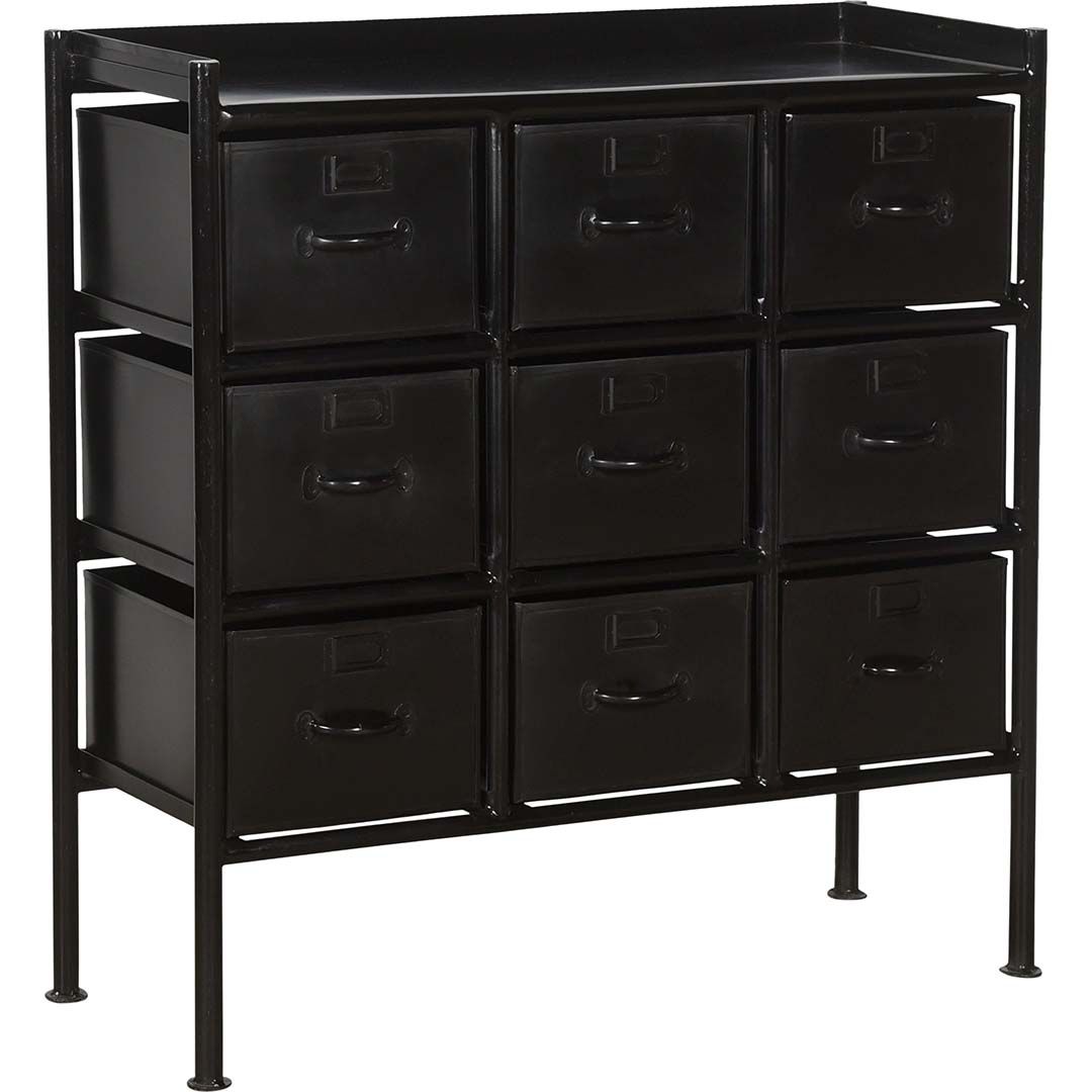 Kommode med et råt design og cool finish i sortlakeret jern. Kommoden kan bruges i alle rum, hvor du har brug for praktisk opbevaring. Det industrielle og enkle look vil passe ind i næsten alle indretninger. Kommoden har 9 rummelige skuffer, som gør den yderst praktisk og funktionel. Hver skuffe er 18 cm høj, 25 cm bred og 29 cm i dybden, så der er rigtig god opbevaringsplads. I samme serie finder du andre modeller og farver. Søg under Saga i shoppen.