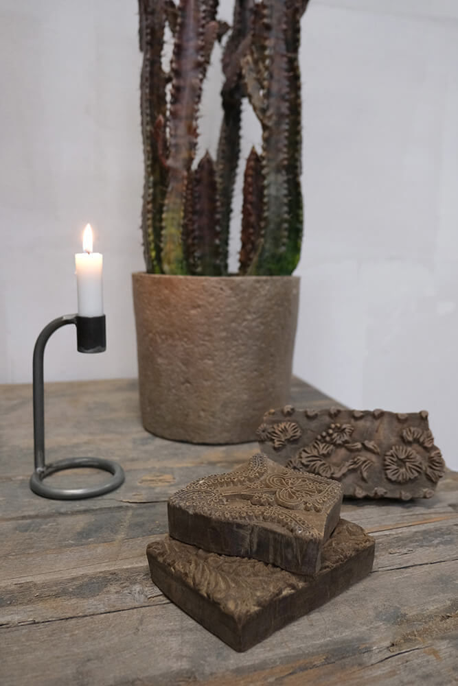 Lysestage i jern med et enkelt råt udtryk der både giver kant og personlighed til indretningen. Stagen er 16 cm høj. Brug kronelys til stagen.