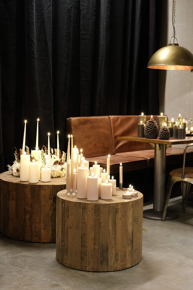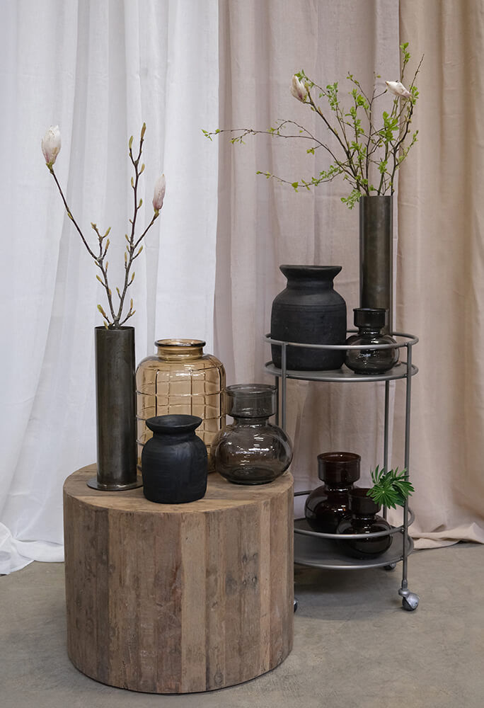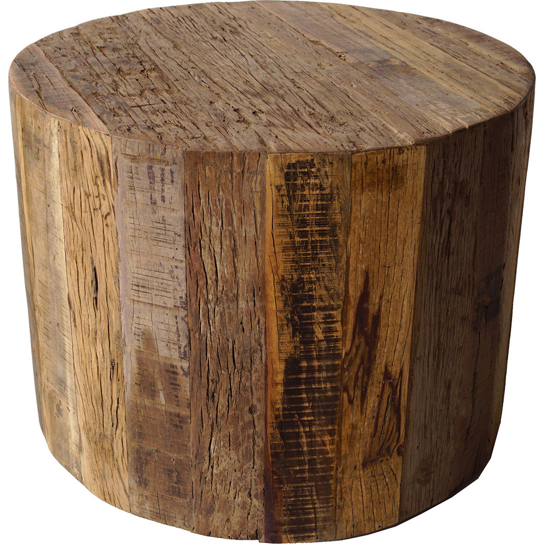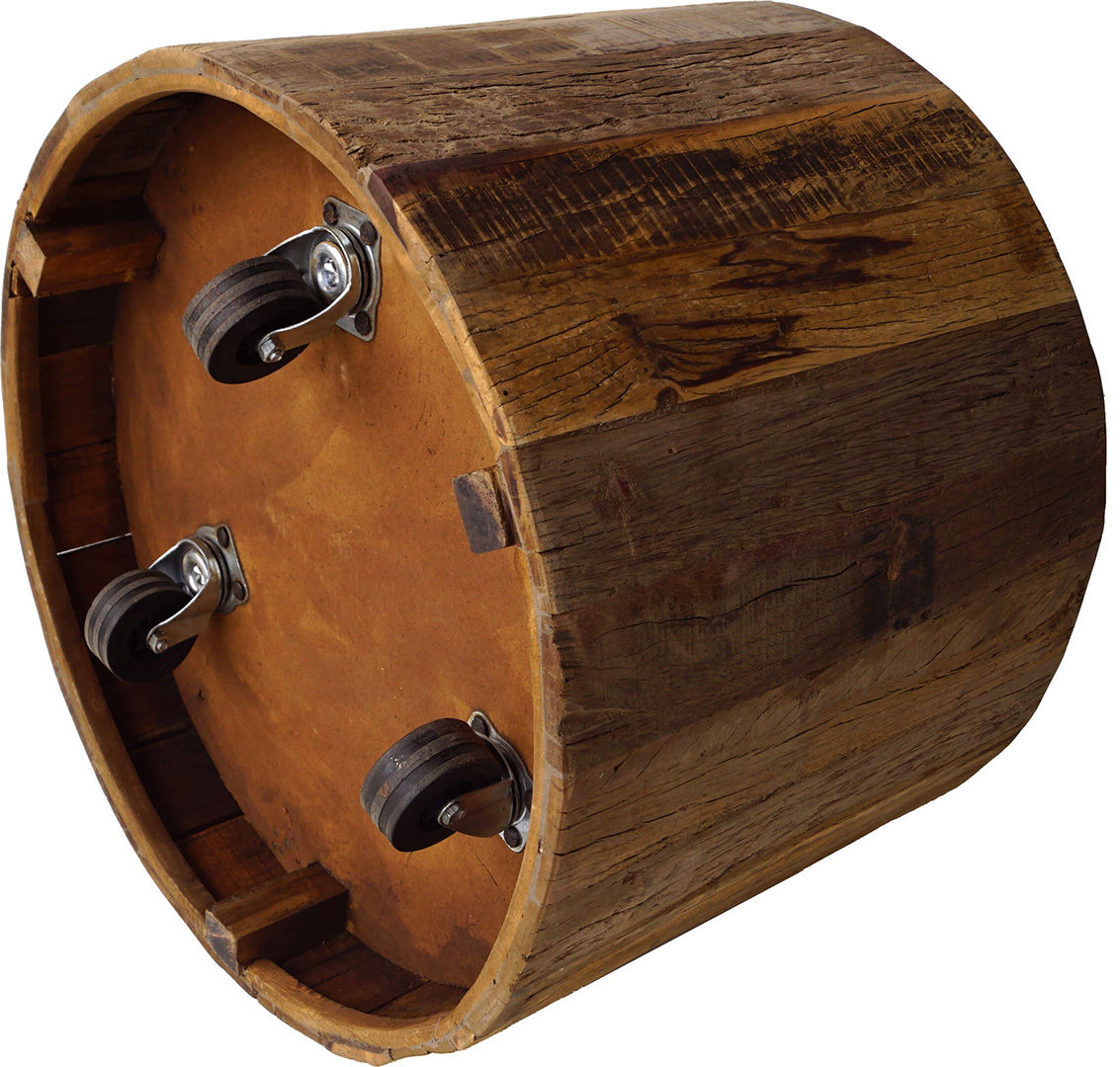 Dette cylinderformede træbord har et råt og skulpturelt udtryk. Bordet er fremstillet af genbrugstræ og der er monteret 3 hjul under det, hvilket gør det let at flytte rundt på. Bordet har flere funktionsmuligheder. Brug det som en skammel, lampebord eller sofabord. Det uslebne og rå genbrugstræ der er brugt i fremstillingen, giver sidemøblet et rustikt udtryk og passer til både den nordiske og den maskuline indretningsstil.