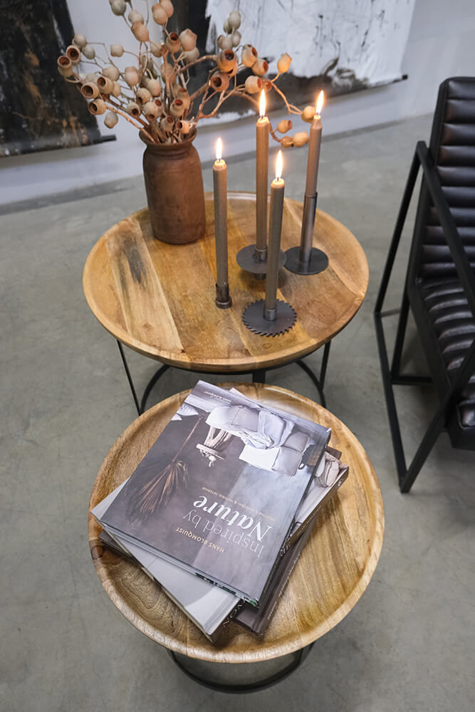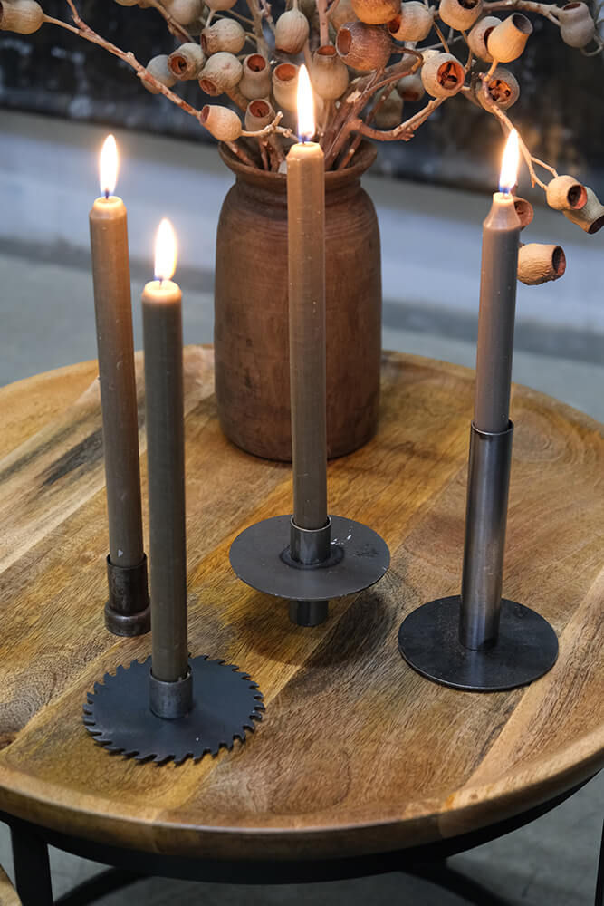Disse mageløse lysestager er inspireret af gamle savklinger, hvilket giver dem et råt og industrielt udtryk. Hver lysestage har en base af en savklinge, der tilføjer karakter og kant til stagen. Den cylindriske lysholder er monteret i midten af savklingen og skaber en perfekt kontrast mellem det grove værktøjsmateriale og den simple funktion. Disse lysestager er ideelle til dig, der ønsker at tilføre noget maskulint og rustikt til din indretning – perfekte til restauranter, caféer eller hjem med et råt, industrielt tema.