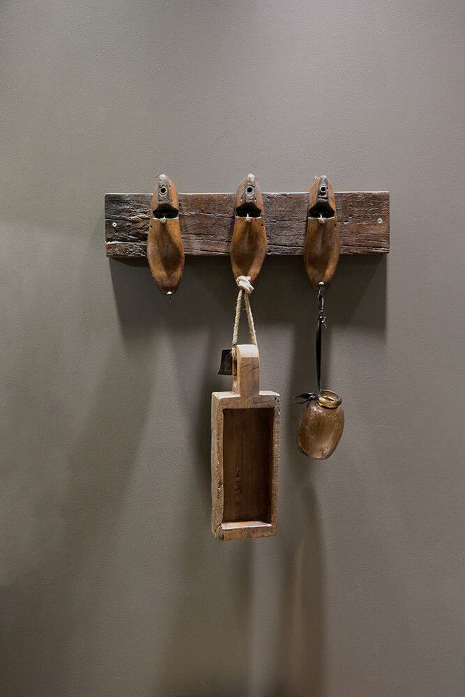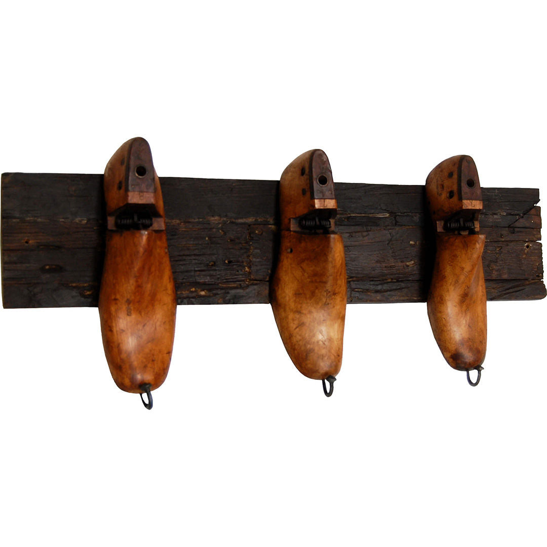 Til fremstilling af denne knagerække er der brugt 3 originale gamle skolæster i træ, som er monteret på en solid genbrugsplanke. I spidsen af hver skolæste er der påsat en krog, hvilket gør skolæsten velegnet til at hænge tøj, accessories eller bøjler på. Disse gamle skolæster har tidligere været brugt i fremstillingen af sko. I dag bruges ofte læster af plastik, fordi det i modsætning til træ ikke påvirkes af fugtighed og derfor bevarer sin form. Knagerækken passer ind i mange rum både i din bolig og i indretningen af din business. Denne knagerække er det perfekte valg, hvis du er fan af naturlige materialer og gerne vil have en naturlig og rustik indretning.