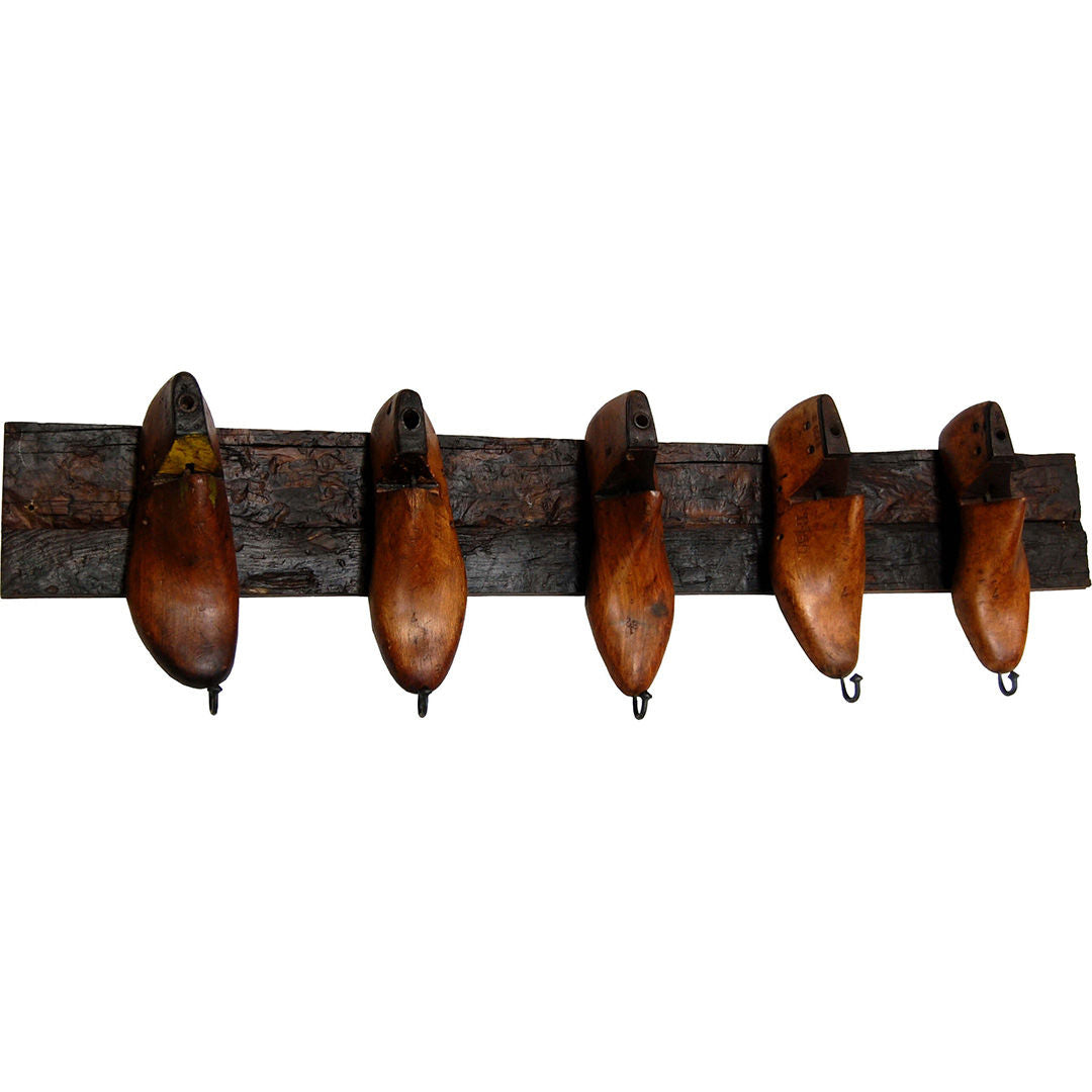 Til fremstilling af denne knagerække er der brugt 5 originale gamle skolæster i træ, som er monteret på en solid genbrugsplanke. I spidsen af hver skolæste er der påsat en krog, hvilket gør skolæsten velegnet til at hænge tøj, accessories eller bøjler på. Disse gamle skolæster har tidligere været brugt i fremstillingen af sko. I dag bruges ofte læster af plastik, fordi det i modsætning til træ ikke påvirkes af fugtighed og derfor bevarer sin form. Knagerækken passer ind i mange rum både i din bolig og i indretningen af din business. Denne knage er det perfekte valg, hvis du er fan af naturlige materialer og gerne vil have en naturlig og rustik indretning.