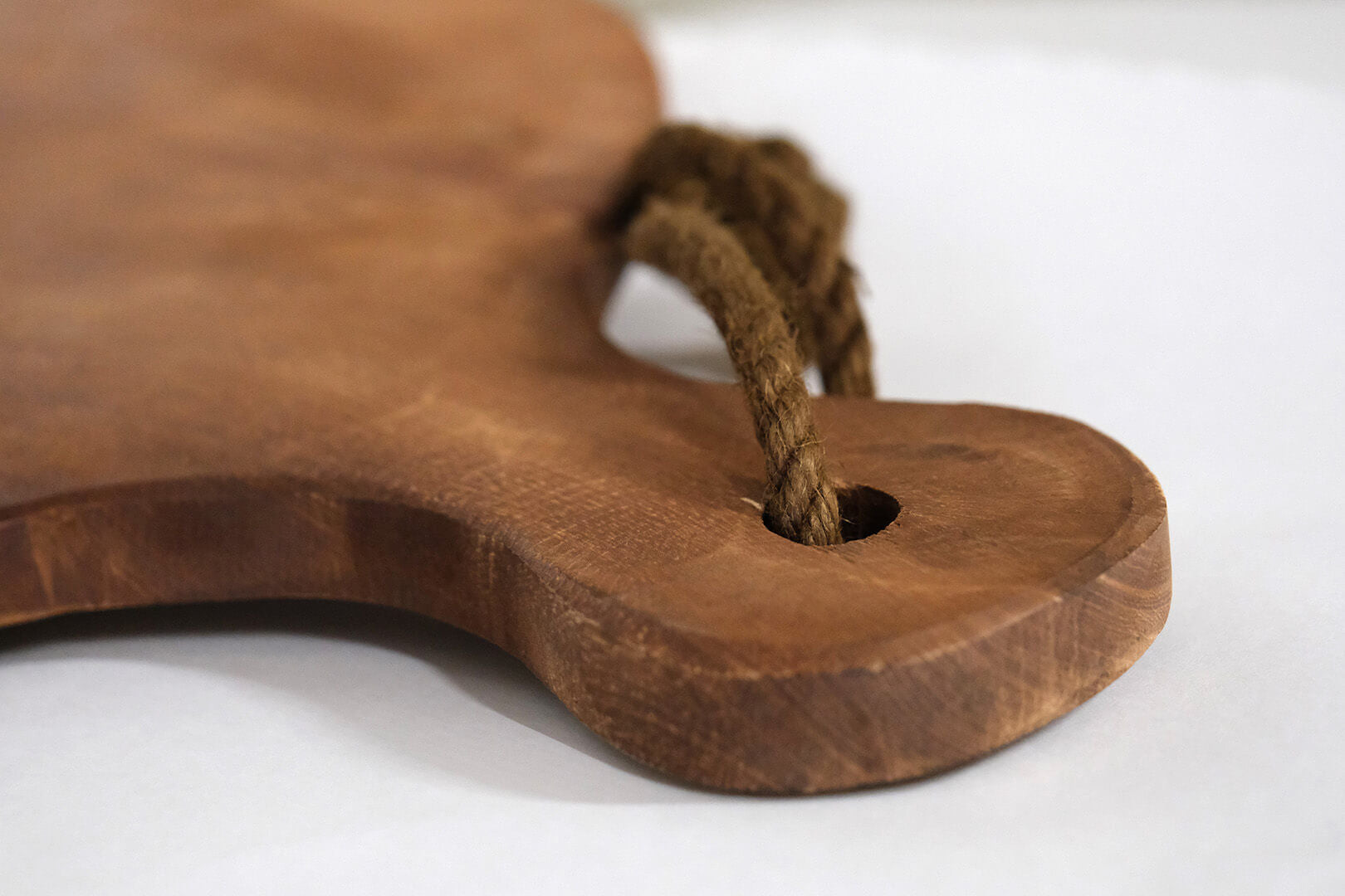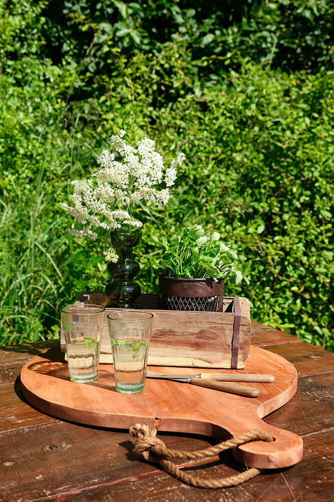 Rustikt, rundt skærebræt i træ. Dette flotte skærebræt giver ikke blot god plads men også et solidt fundament til at svinge køkkenkniven. Det rå træ, som skærebrættet er lavet af, gør det også ideelt til at anrette en lækker tapas, friskskåret frugt eller måske en lille pizza. Brug vand og sæbe til rengøringen, og forlæng holdbarheden ved at smøre brættet med vegetabilsk olie. Opvaskemaskine anbefales ikke.
