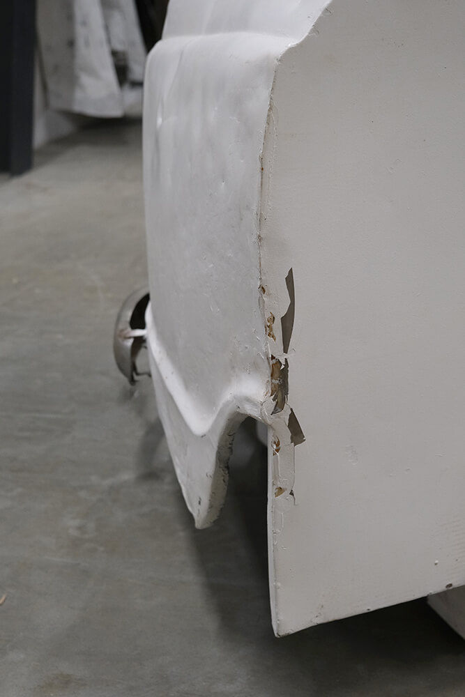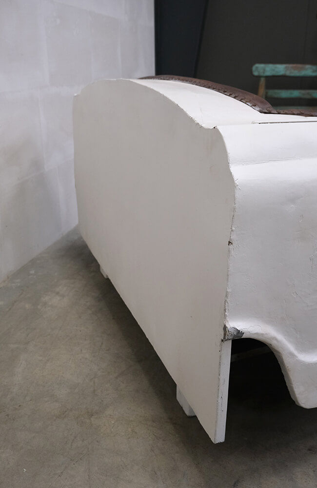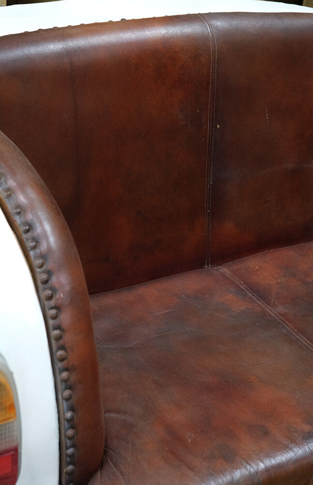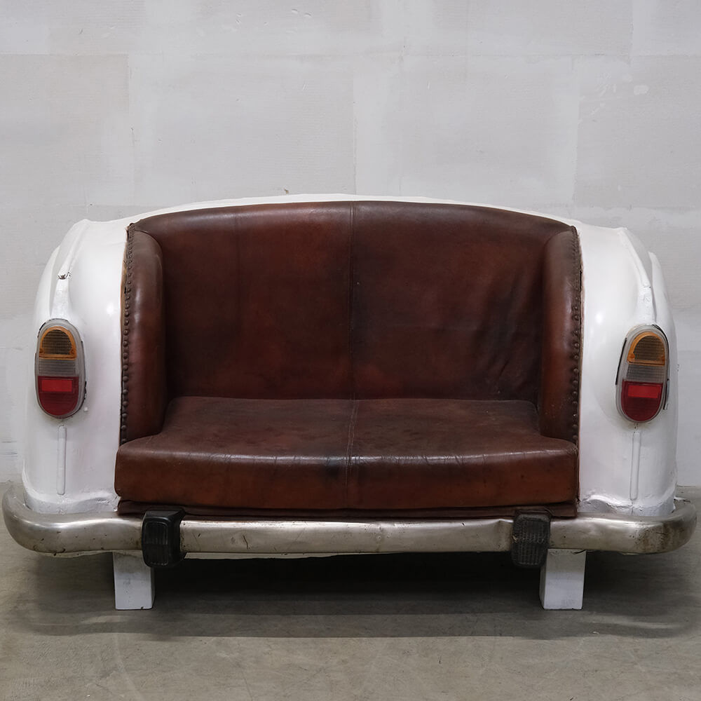 Denne sjove bilsofa er skabt af bagenden fra en gammel indisk bil, hvilket giver den et råt og autentisk udtryk. Sædet og ryggen er betrukket med patineret, brunt læder, der fremhæver sofaens vintage vibe. Bilens originale lygter og kofanger er bevaret og tilføjer et quirky og industrielt twist til designet. Sofaen er et fantastisk statement-piece, der både kan fungere som blikfang i en restaurant, bar eller et kontor med karakter. Bilsofaen kombinerer en sjov historie med et råt design, der skiller sig ud. Bemærk at der er et lille hul i læderet på sædet, samt to steder på bagsiden af sofaen, hvor malingen er skallet lidt af. Dette er afspejlet i prisen.