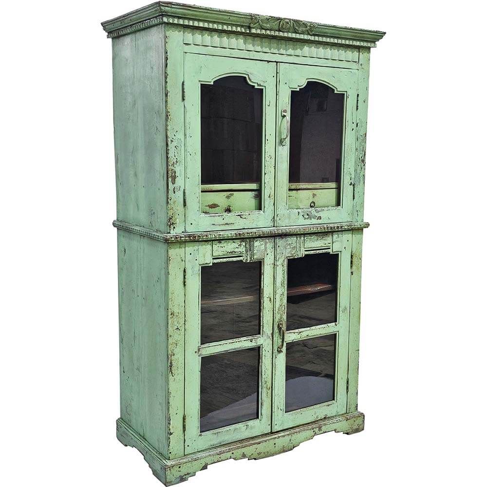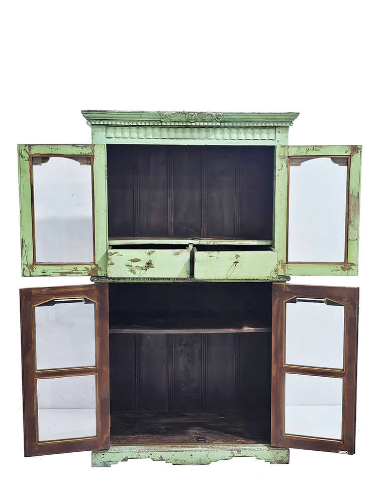 Et unikt, charmerende skab i en frisk grøn nuance med tydelig patina og masser af sjæl. Skabet har dobbelte glaslåger både foroven og forneden, så man kan udstille indholdet. De små udskæringer og den diskrete dekoration i toppen tilføjer en nostalgisk og autentisk stemning. Skabet emmer af historie og giver et strejf af vintage romantik. Perfekt til opbevaring af glas og tallerkener i en restaurant, som udstillingsskab i en butik eller til bøger og nips i hjemmet. Dette skab er yderst praktisk, da det bringer både charme og funktionalitet med sig.