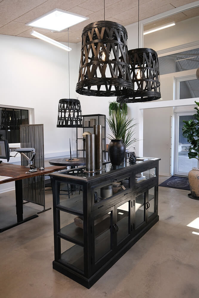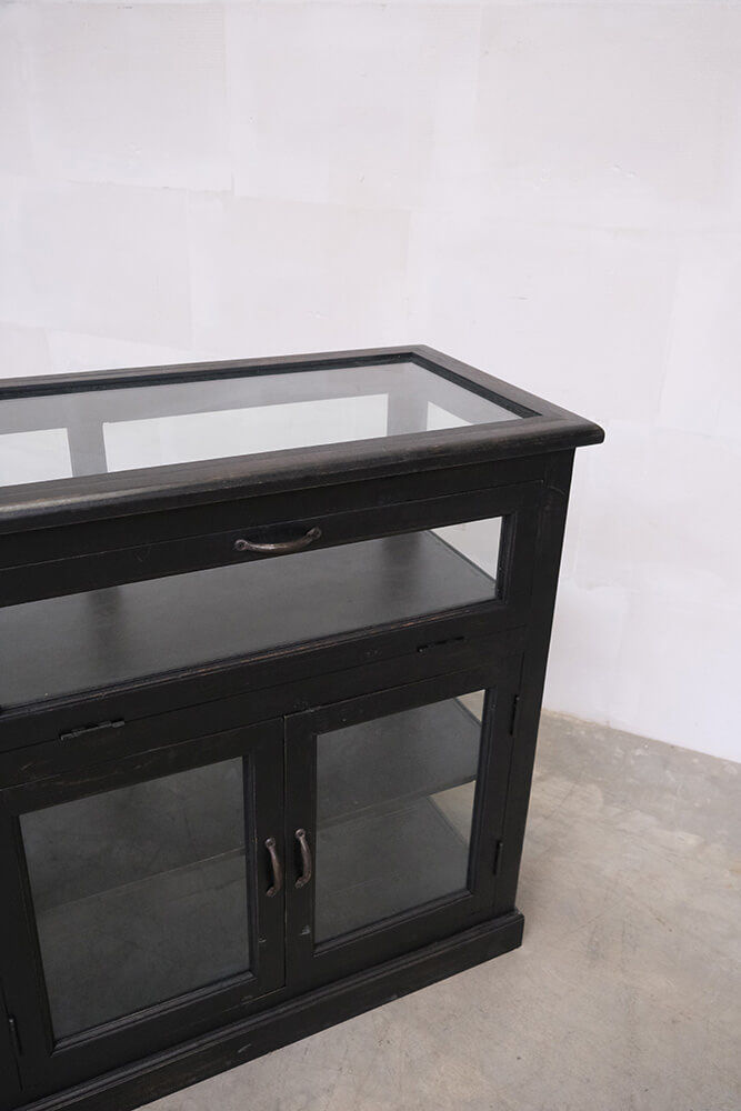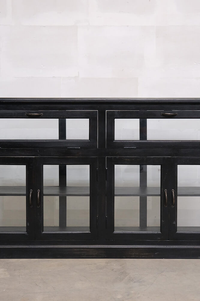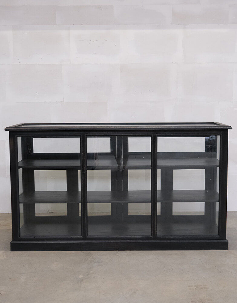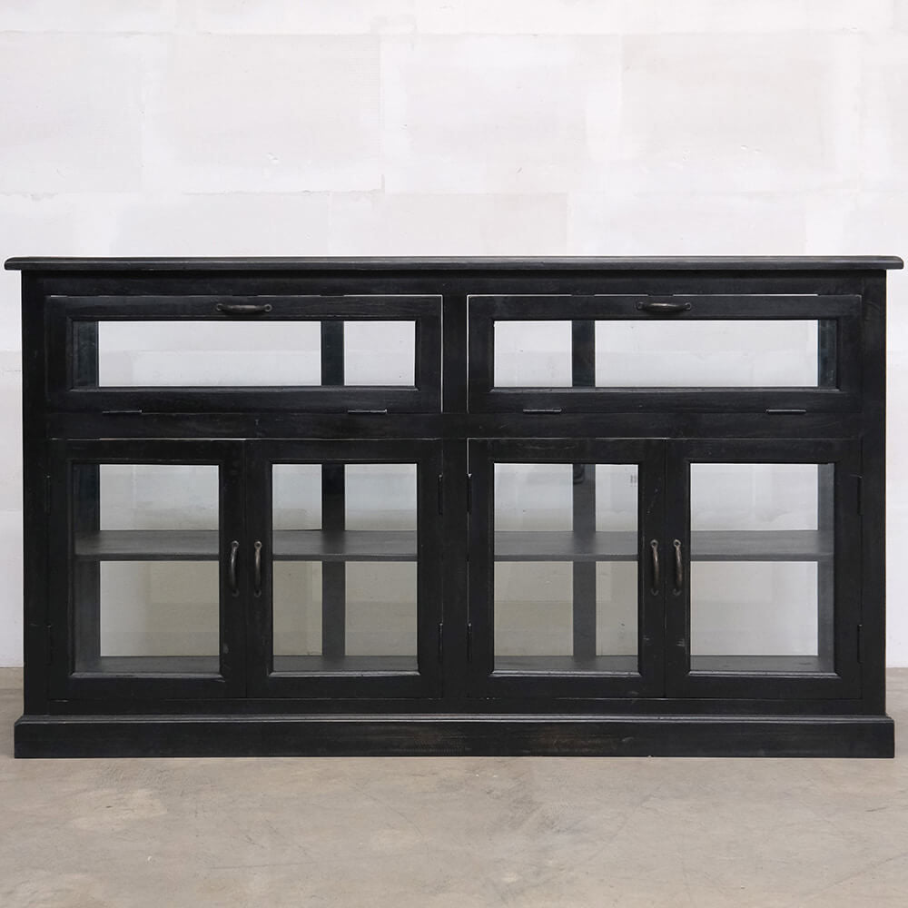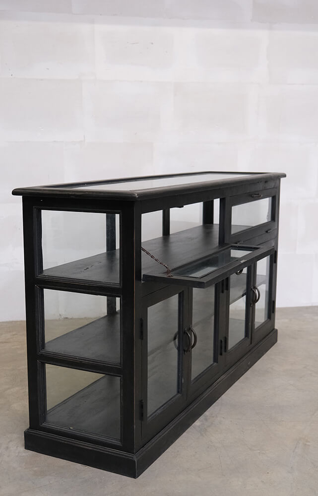 Smuk skænk i sortmalet træ og glas og med seks glaslåger og to træhylder. Mangler du en ny butiksdisk, udstillingsmontre eller blot en ny skænk, så er her vores bud på en virkelig fin en af slagsen. Her er der nemlig rig mulighed for få udstillet de varer, man ønsker ekstra fokus på eller blot alle ens yndlingsgenstande som kunst, bøger eller keramik. Skænken kan både stå op ad en væg eller frit i rummet, hvad end man vælger, vil den med garanti skabe blikfang og skabe en stemning.