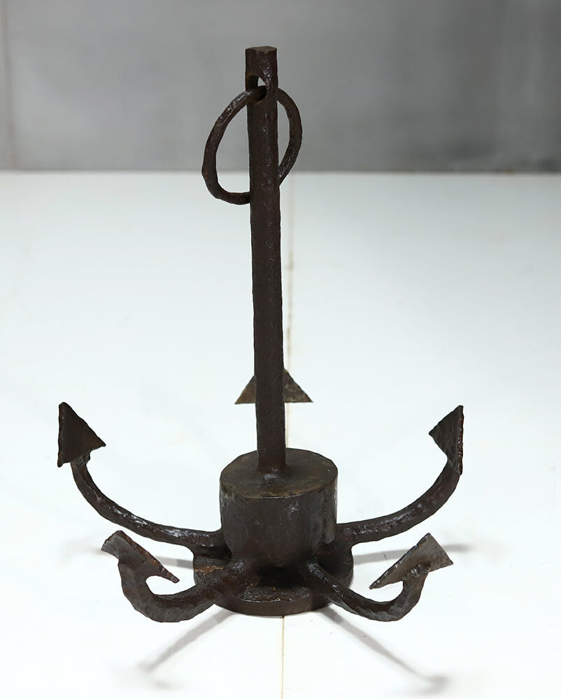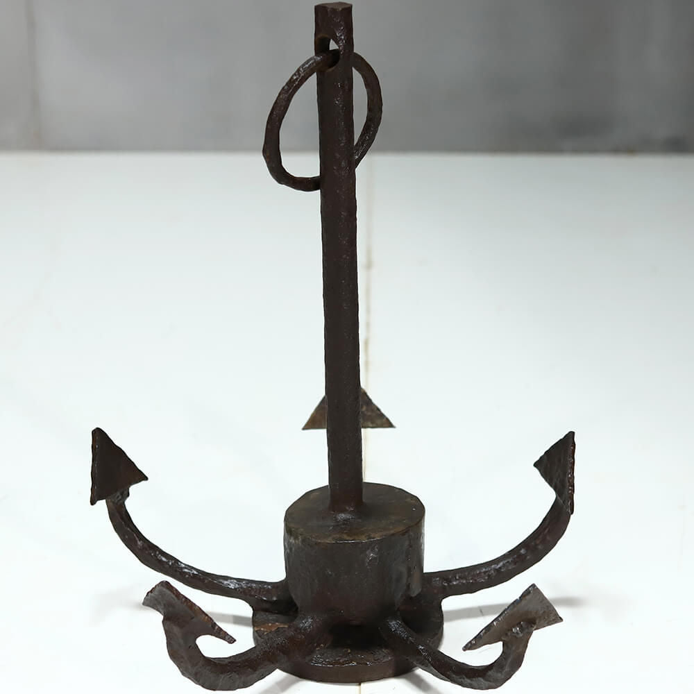 Dette rustne skibsanker med fem spidse kroge har et cool og industrielt udseende. Krogene er stærke og målrettede, hvilket giver et hårdt og råt look. Ankeret er solidt og passer perfekt som en statement piece i en restaurantindretning med maritimt tema. Stil det på gulvet eller hæng det op i det store øje øverst på ankeret. Vær dog opmærksom på at ankeret et ret tungt.
