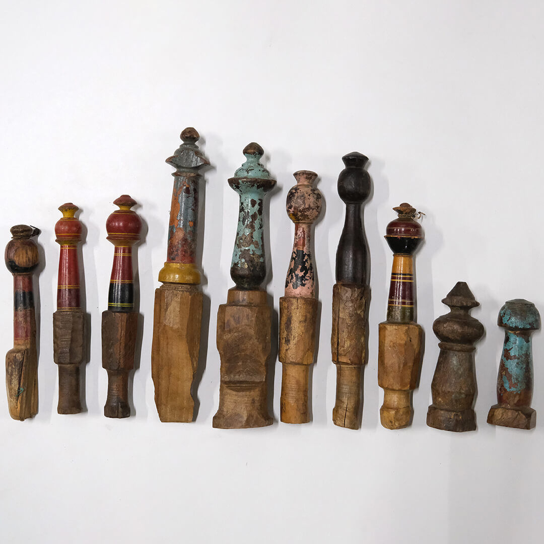 Original gamle og meget dekorative træpinde med et sjovt og unikt look. Træpindene har været brugt som dekoration på gamle indiske møbler. Pindende købes i en pakke a 10 styk og er alle forskellige i farver og udskæringer. Brug dem som deko og giv indretningen et stemningsfyldt og unikt præg.