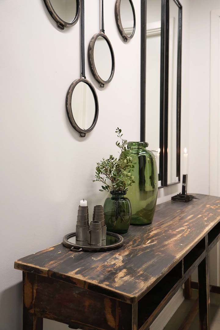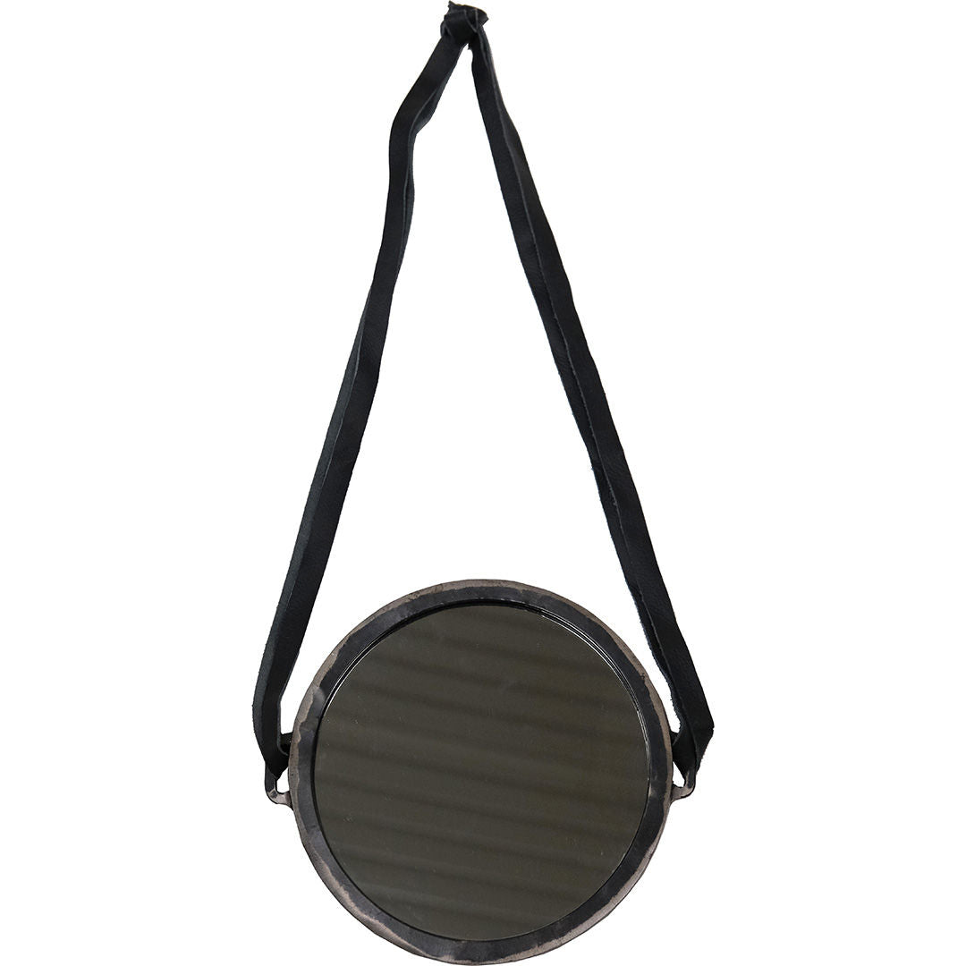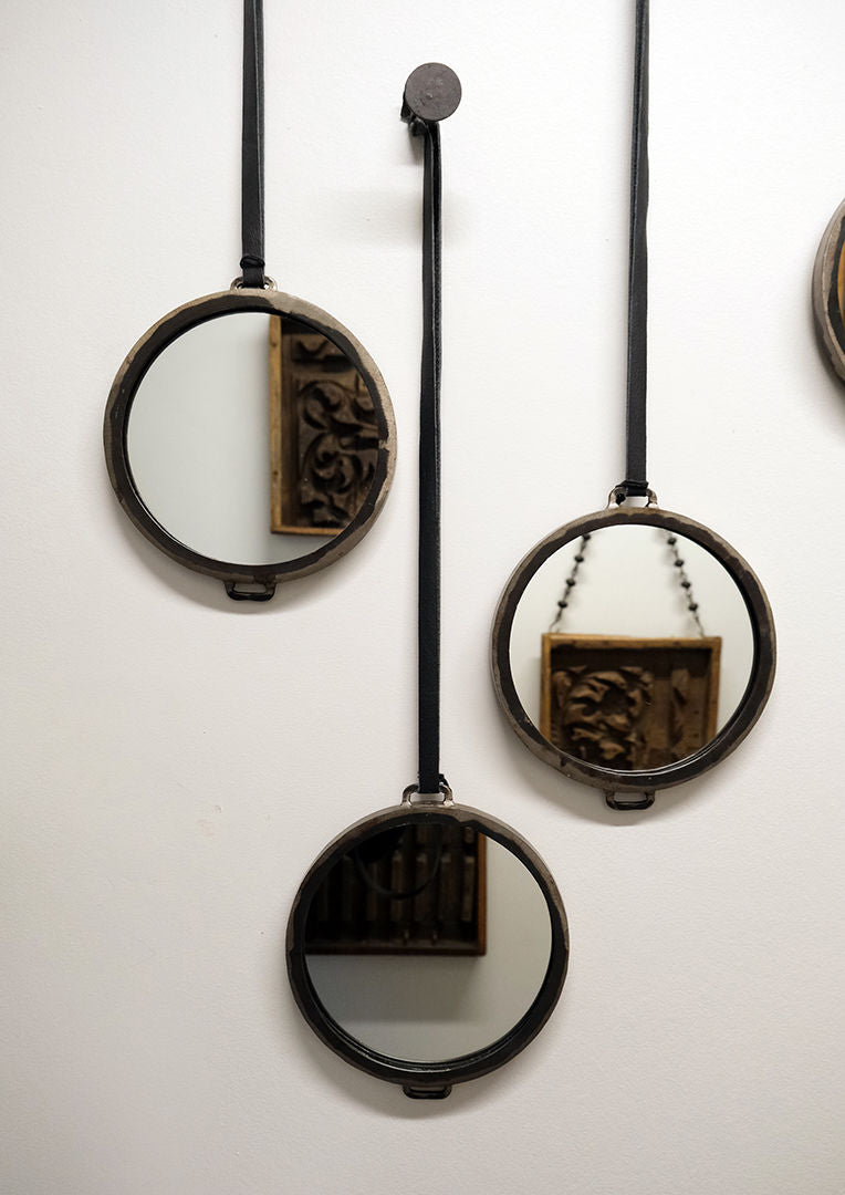 Rundt spejl i et råt design med lædersnor til ophæng. Runde former giver et fint modspil til andre kanter man ellers indretter med. Lille spejl på væggen der....