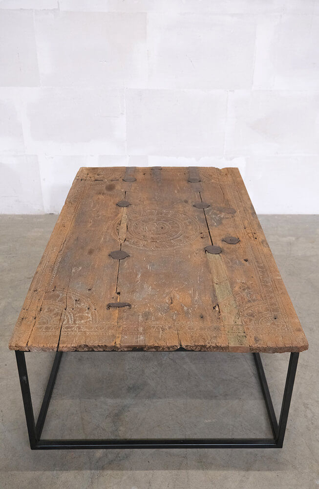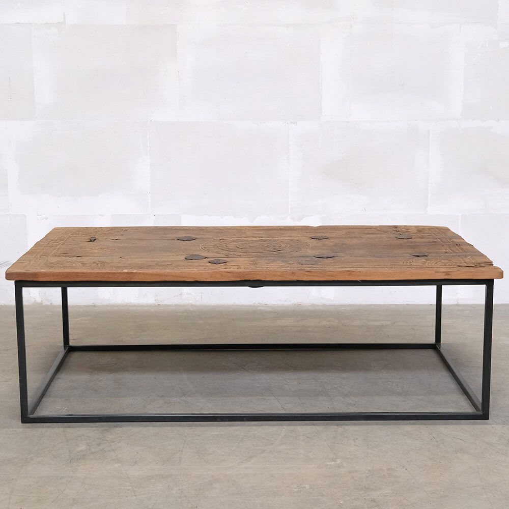 Dette skønne sofabord er et råt og charmerende møbel til din indretning. Bordpladen er skabt af en gammel dør, der har fået nyt liv med sine originale udskæringer og patinerede overflade. De smukke detaljer fortæller historier fra fortiden og giver bordet en autentisk karakter. Det sorte jernstel, som er behandlet med klar lak, skaber en flot kontrast til den rustikke træplade og giver bordet et industrielt udtryk. En perfekt kombination af råt og charmerende, som passer lige godt i hjemmet, en hyggelig café eller en stilfuld butik. Bordet er en one of a kind, og variationer i træets struktur og udtryk er en del af charmen.