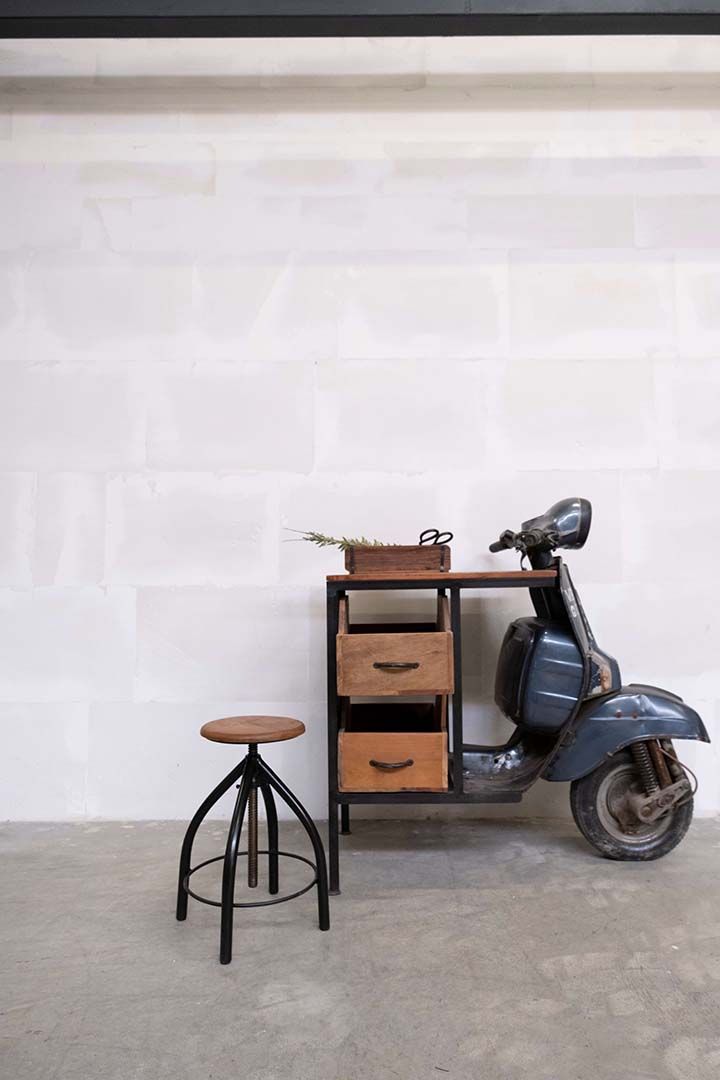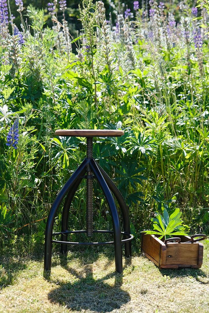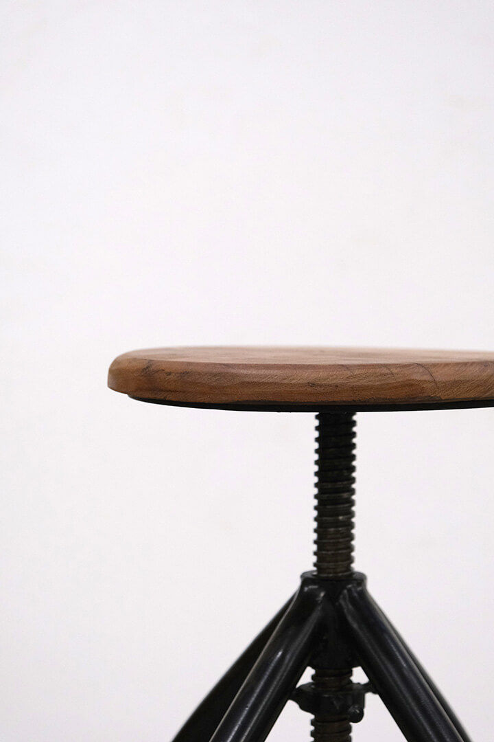 Virkelig skøn drejeskammel i jern med et cool træsæde lavet af genbrugstræ. Skamlen er fleksibel i højden, da den kan justeres op eller ned alt efter hvilken højde du ønsker. Den kan altså bruges af voksne som børn, og i hvilket som helst rum i din bolig, eller i din butik, hvor du har brug for en justerbar stol. Den vil også være skøn at bruge som et sidebord til din kaffe, en vase med friske blomster eller lignende, der hvor du ikke har så meget plads. H: fleksibilitet på max 62cm - min. 41cm