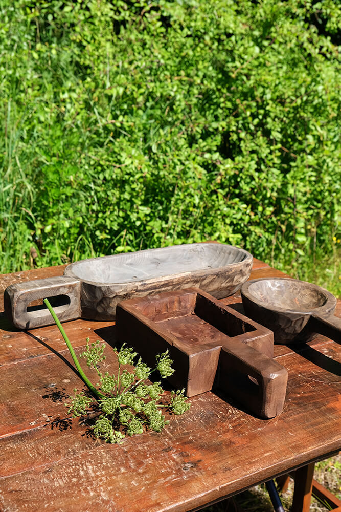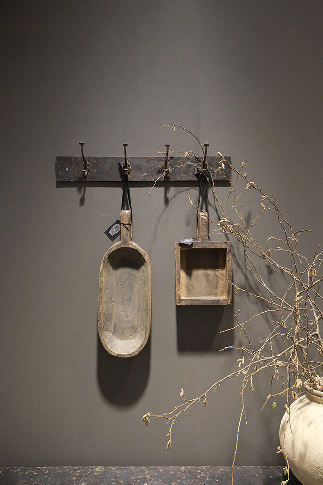 Rustik lille træskål med hank. Træskålen er lavet i genbrugstræ og ingen af skålene er derfor identiske. Træskålene har en hank med hul i, så der kan let monteres en snor i hanken og den kan hænges op på væggen sammen med dine skærebrætter. Brug disse fine skåle til at gøre din anretning ekstra rustik.