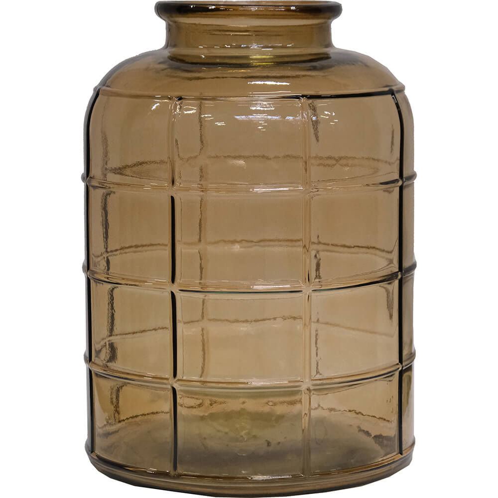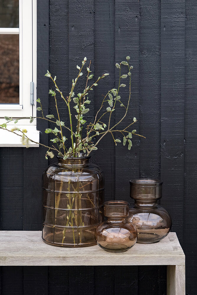 Denne vase i genbrugsglas er skabt med et tidløst design, der passer perfekt til enhver indretning. Den røgfarvede glasoverflade lader lyset skinne igennem, hvilket skaber en fantastisk effekt, når solen rammer den. Uanset om du ønsker at dekorere din spisestue, stue eller soveværelse, vil denne vase være et stilrent og bæredygtigt valg.