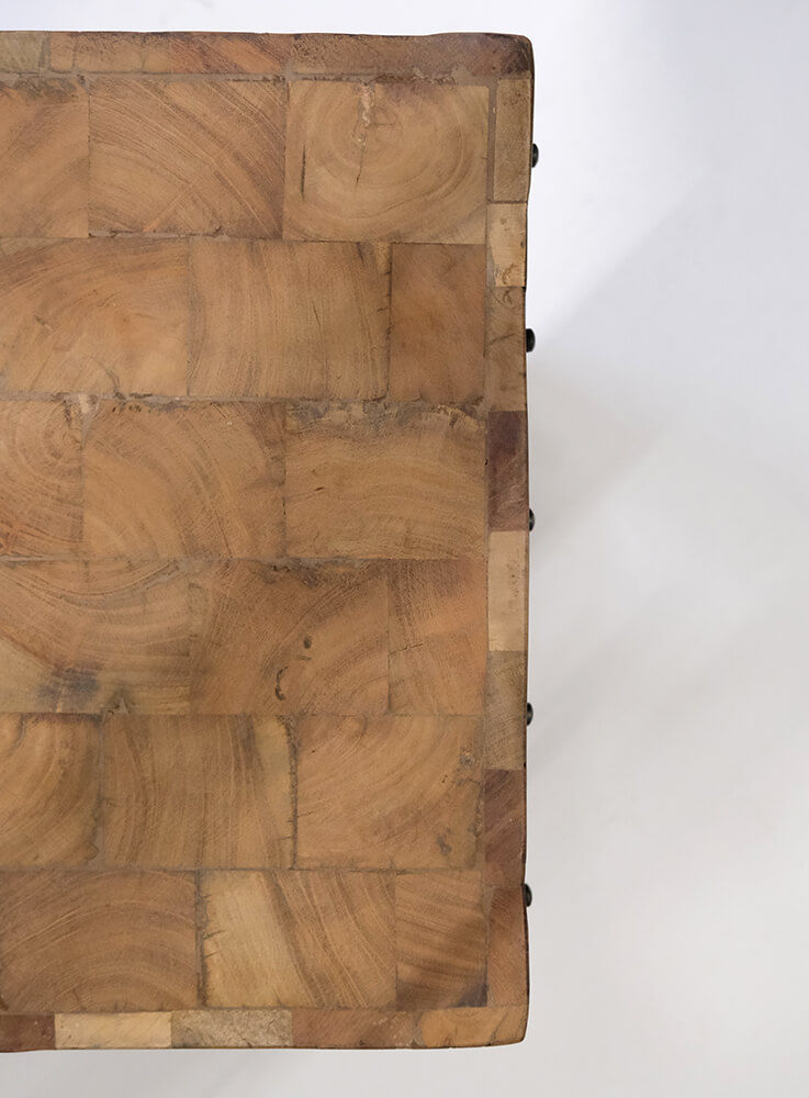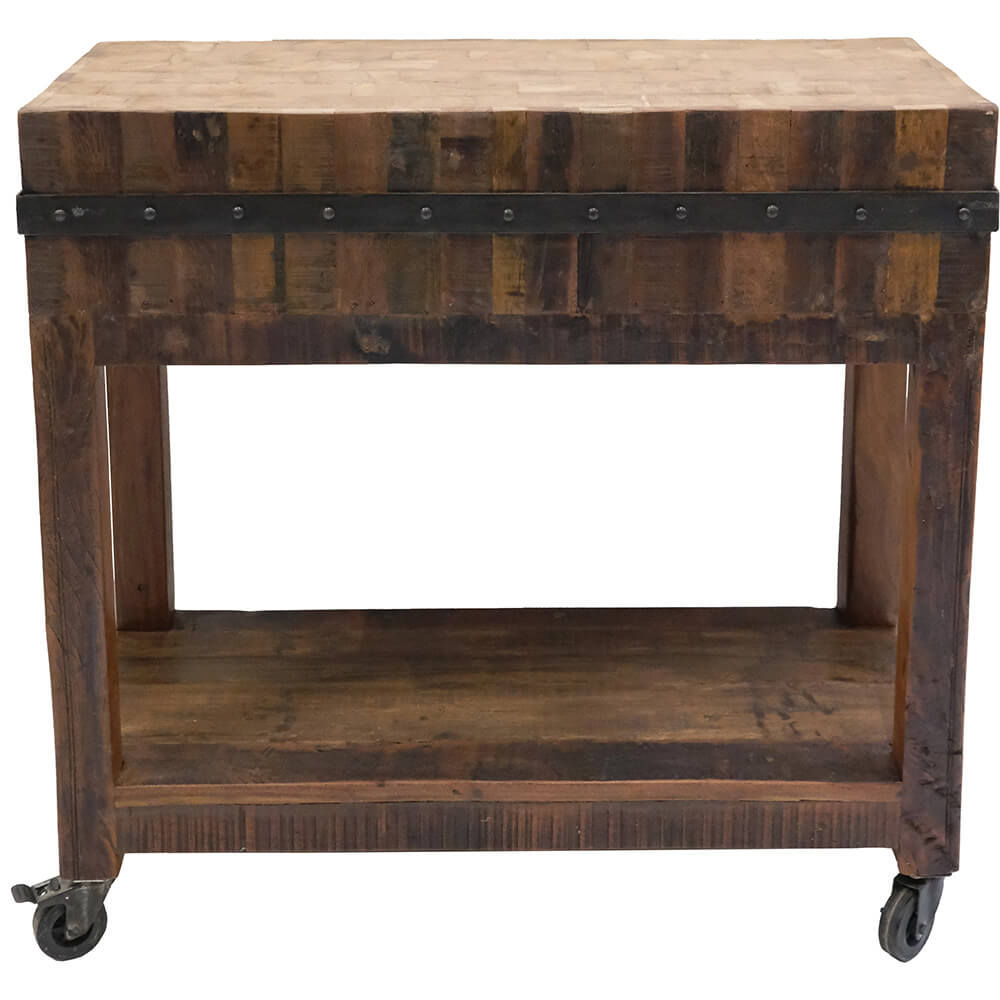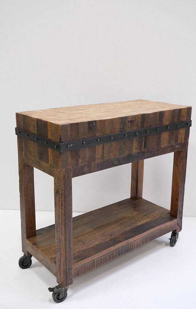 Vores store butcherblok i genbrugstræ og jern kombinerer rustisk charme med praktisk funktionalitet. Med sin robuste træoverflade, rå detaljer og nitter, tilføjer dette møbelstykke karakter til ethvert køkken eller spisestue. De monterede hjul gør det nemt at flytte rundt, mens en praktisk opbevaringshylde tilføjer ekstra opbevaringsplads til dine køkkenredskaber. Skab en praktisk og rå arbejdsstation med vores butcherblok, der giver både stil og funktion i ét.