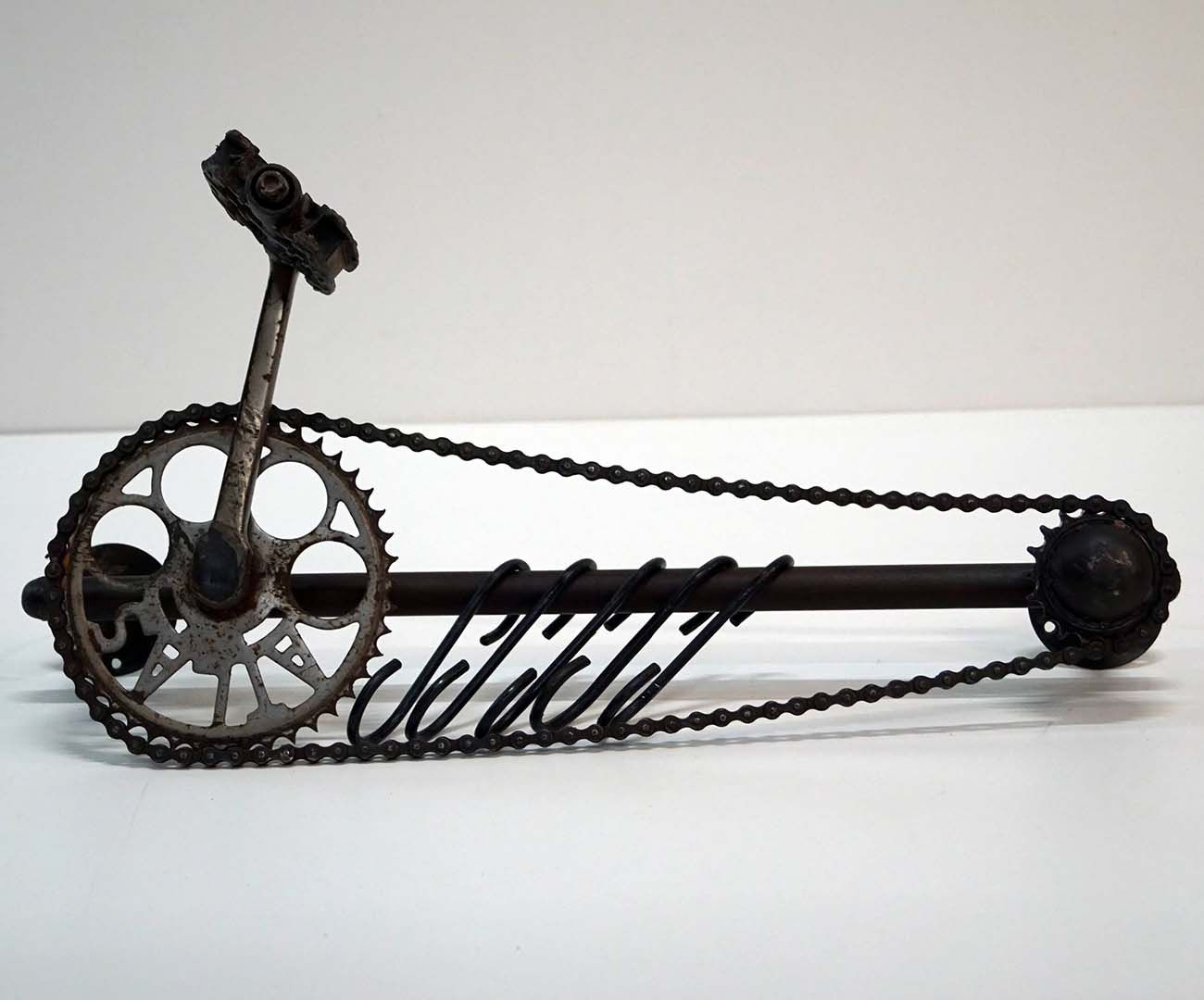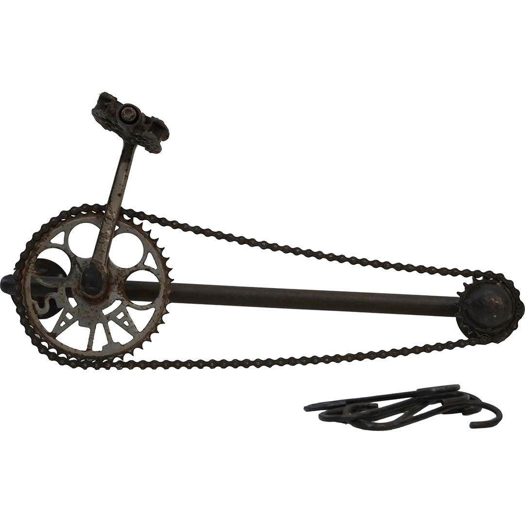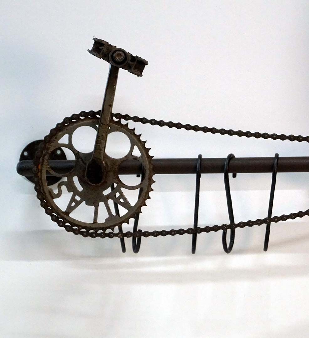 Her har vi haft gang i upcycling. Vi har brugt cykelkæde og pedal fra en gammel cykel og tilført fittings for at skabe en ny og anderledes knagerække. Der følger 5 kroge med til knagerækken. Denne knagerække fremstillet af gamle cykeldele, kan tilføre din indretning et råt og uslebent look og give et sjovt og anderledes tvist til din indretning. Knagerækken kan hænges op i mange forskellige rum både i dit hjem og også i din business. Hæng den op i din entré, i soveværelset eller i prøverummet i tøjbutikken. For dig der tænker bæredygtigt når du handler.