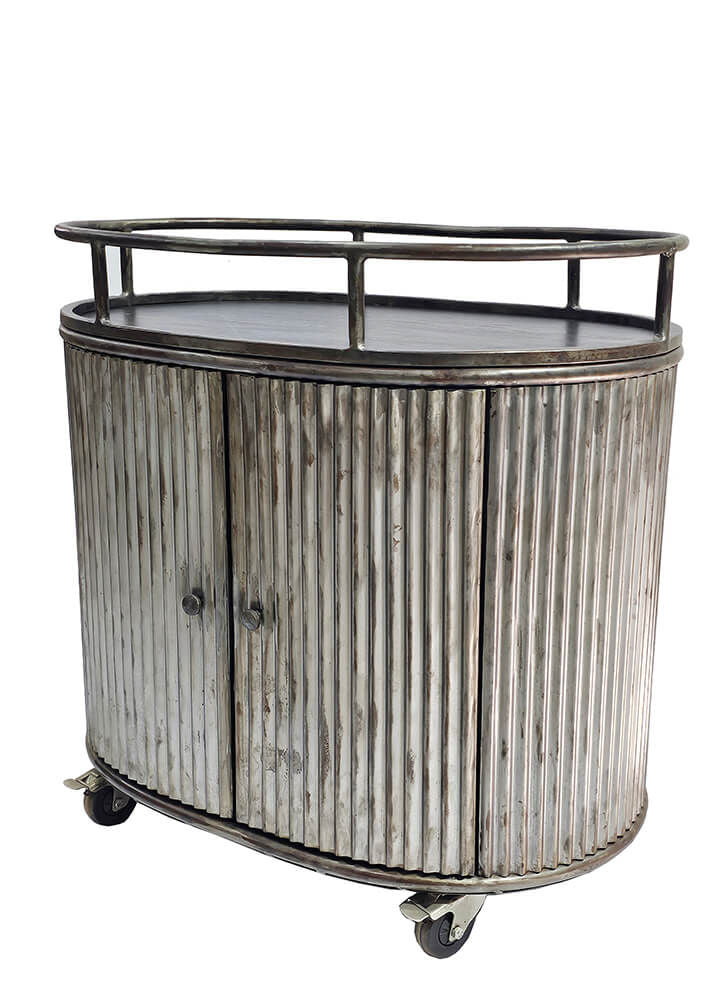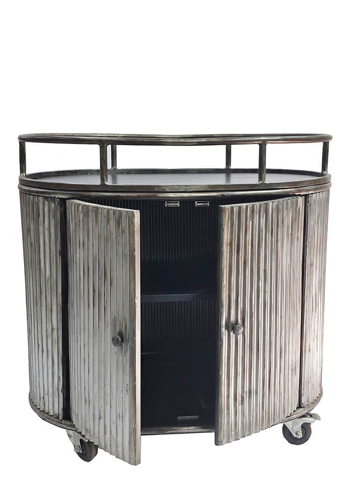 Denne praktiske og rå barvogn er lavet af bølget metal med en rustik finish, der tilfører kant og karakter til ethvert rum. Barvognens ovale form giver den et cool udtryk, mens de fire robuste hjul gør den let at flytte rundt – perfekt til servering eller som en dekorativ opbevaringsløsning. Den har en bordplade, der kan bruges til at fremvise glas og flasker. Bag skabslågerne er der rummelige hylder til ekstra opbevaring, og denne barvogn kombinerer funktionalitet og design. Den indbyggede kant omkring toppen sikrer, at dine genstande står sikkert. En ideel løsning til restauranter, caféer eller hjemmebaren, hvor fleksibilitet og stil er i fokus. Klar til at rulle ind i din indretning!