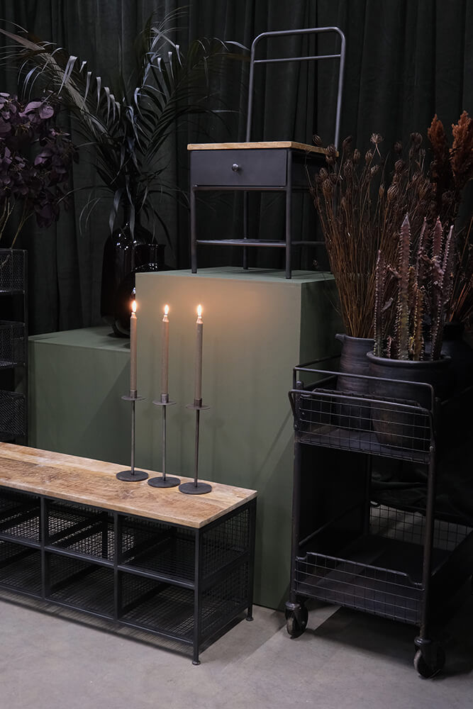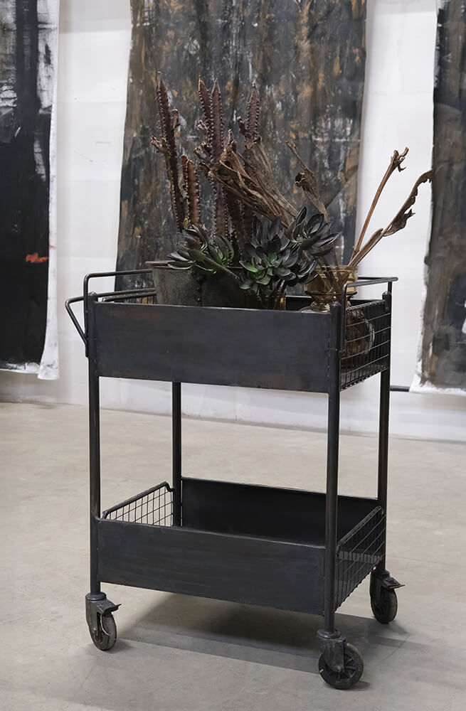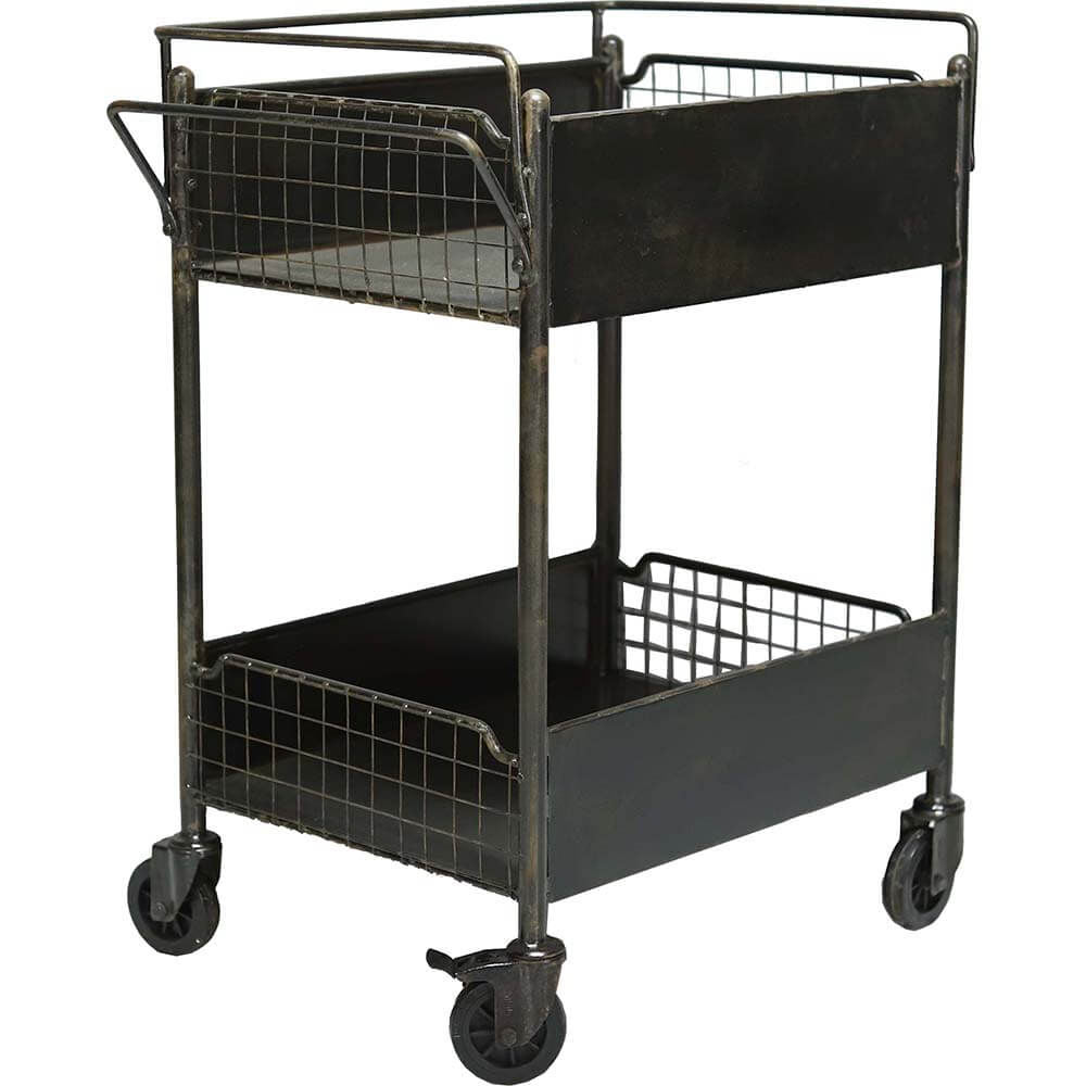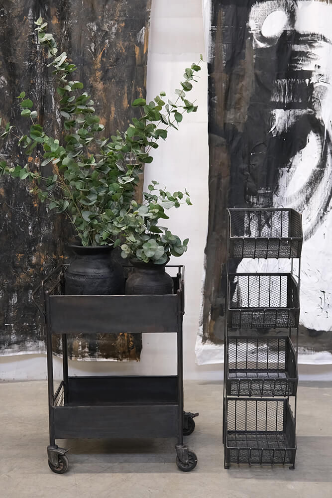 Denne rå, industrielle rullevogn er lige så praktisk, som den er cool. Med sit robuste jernstel og høje kanter er den designet til at holde styr på alle dine ting – uden at gå på kompromis med stilen. De store hjul gør den let at flytte rundt, mens de to rummelige hylder giver masser af opbevaringsplads. Brug den i din restaurant eller café til at organisere serveringsudstyr eller som en mobil barvogn. I hjemmet kan den være den perfekte hjælper i køkkenet, eller som en lækker opbevaringsløsning i stuen. Uanset hvor du placerer den, vil denne rullevogn tilføje et råt og funktionelt touch til rummet.