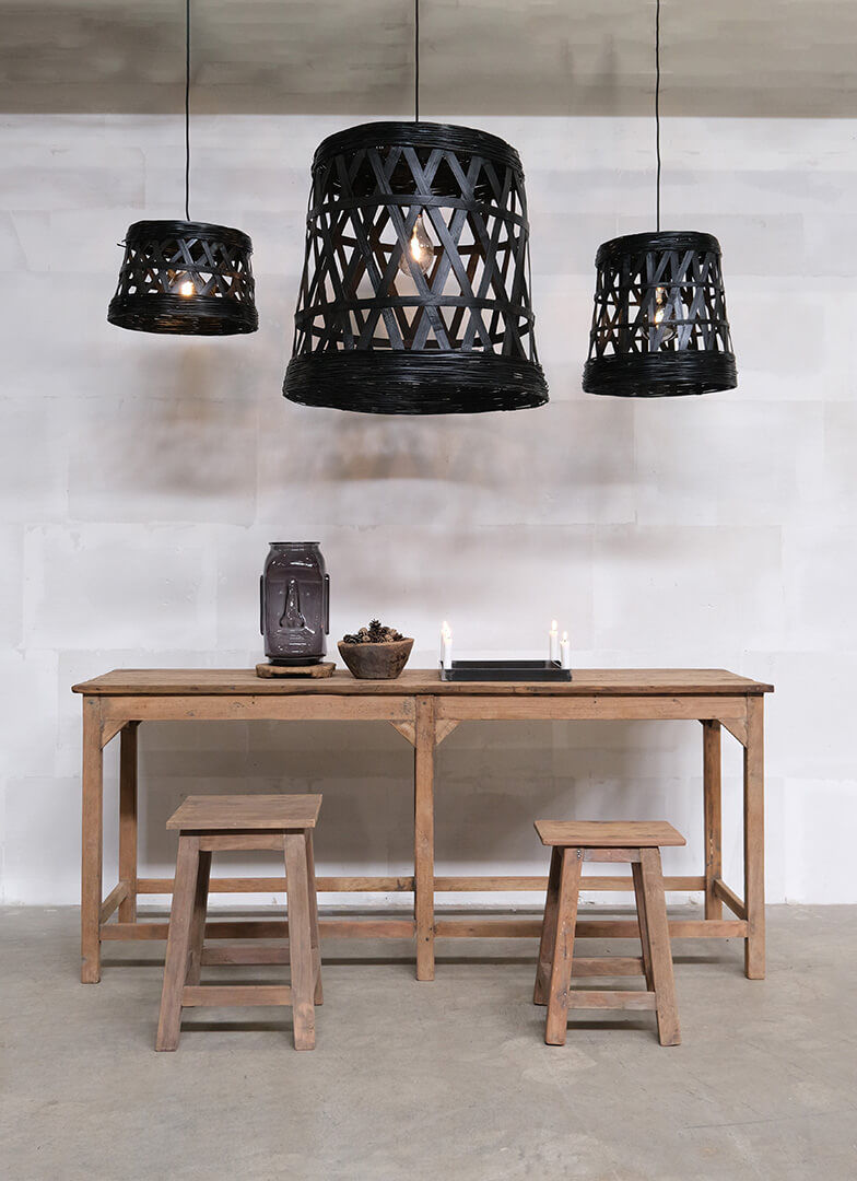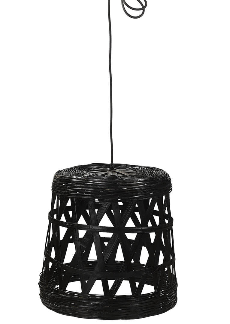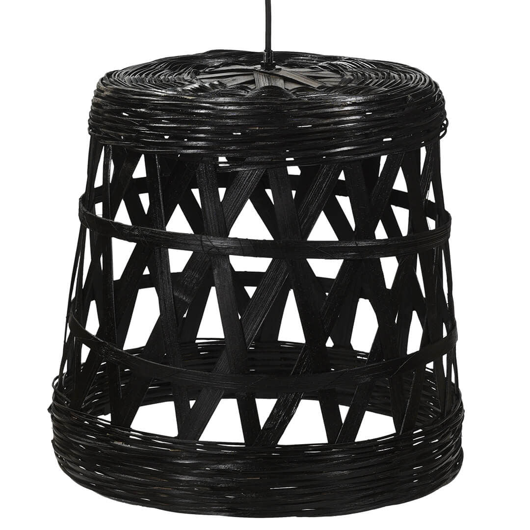 Håndflettet lampeskærm i sortmalet bambus. Lampeskærmen kan bruges, hvor end du ønsker at tilføre din indretning en naturlig og let belysning. Hæng en eller flere lamper sammen hen over spisebordet. Oprindelig var denne lampeskærm tænkt som en kurv, men da vi fik vendt den på hovedet, opstod der magi, og en lampe blev til. Fordi lampen er håndlavet, skal du være opmærksom på, at der kan være variation og små forskelle i både finish og farvemætning fra lampe til lampe. Lampens top har en diameter på 34 cm. Denne lampe findes også i X-large og small.