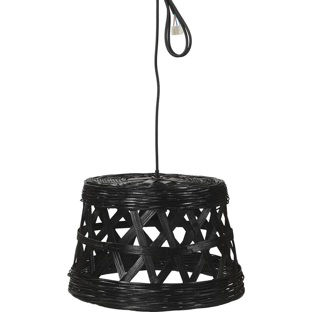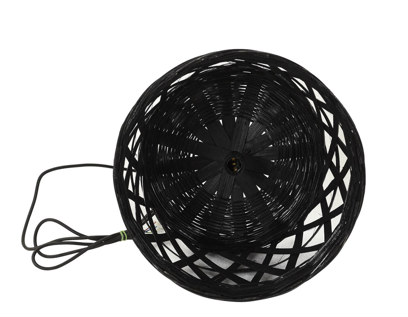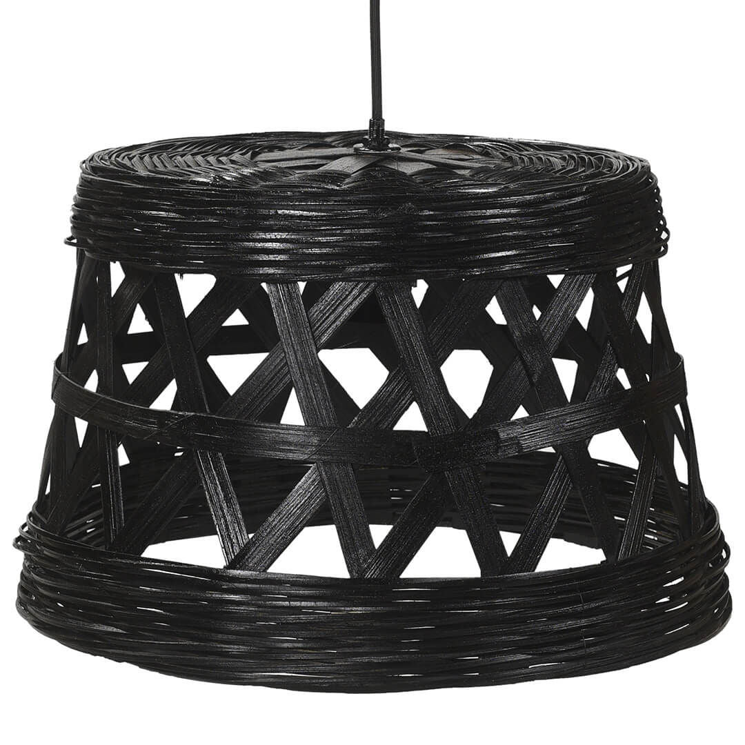 Håndflettet lampeskærm i sortmalet bambus. Lampeskærmen kan bruges, hvor end du ønsker at tilføre din indretning en naturlig og let belysning. Hæng en eller flere lamper sammen hen over spisebordet. Oprindelig var denne lampeskærm tænkt som en kurv, men da vi fik vendt den på hovedet, opstod der magi, og en lampe blev til. Fordi lampen er håndlavet, skal du være opmærksom på, at der kan være variation og små forskelle i både finish og farvemætning fra lampe til lampe. Lampens top har en diameter på 33 cm. Denne lampe findes også i X-large og medium.