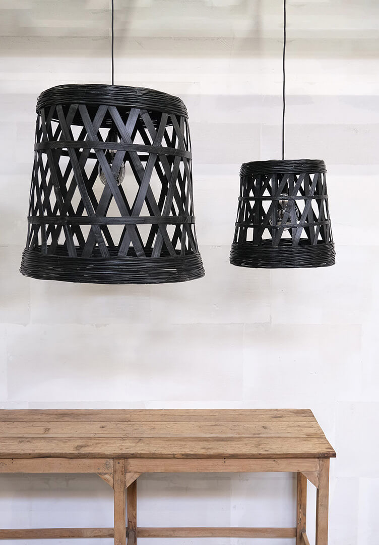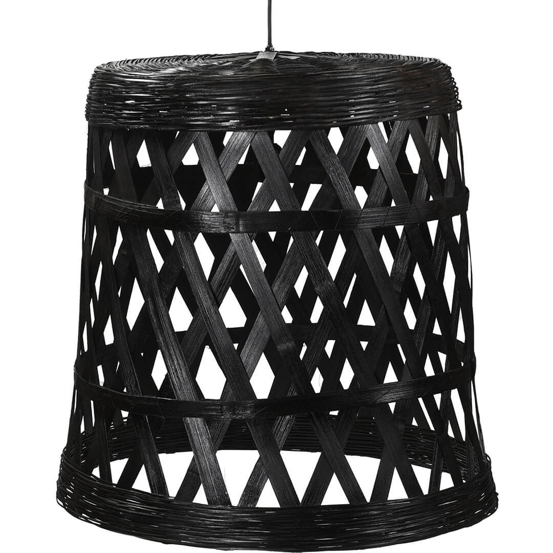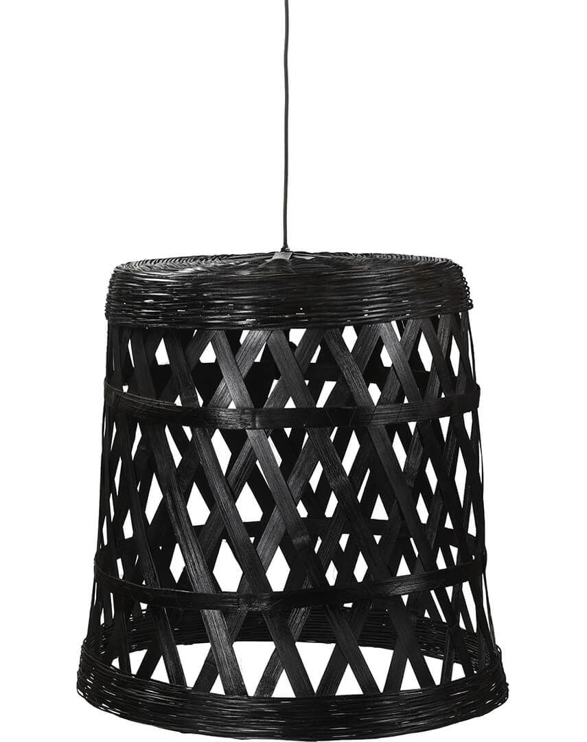 Håndflettet lampeskærm i sortmalet bambus. Lampeskærmen kan bruges, hvor end du ønsker at tilføre din indretning en naturlig og let belysning. Oprindelig var denne lampeskærm tænkt som en kæmpestor kurv, men da vi fik vendt den på hovedet, opstod der magi, og en lampe blev til. Denne gigantiske lampe kræver plads, men du vil få en fantastisk wow effekt i rummet. Fordi lampen er håndlavet, skal du være opmærksom på, at der kan være variation og små forskelle i både finish og farvemætning fra lampe til lampe. Lampens top har en diameter på 61 cm. Denne lampe findes også i medium og small.