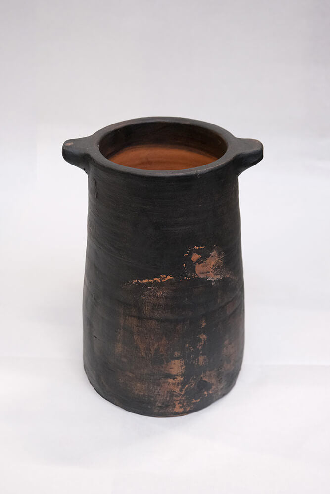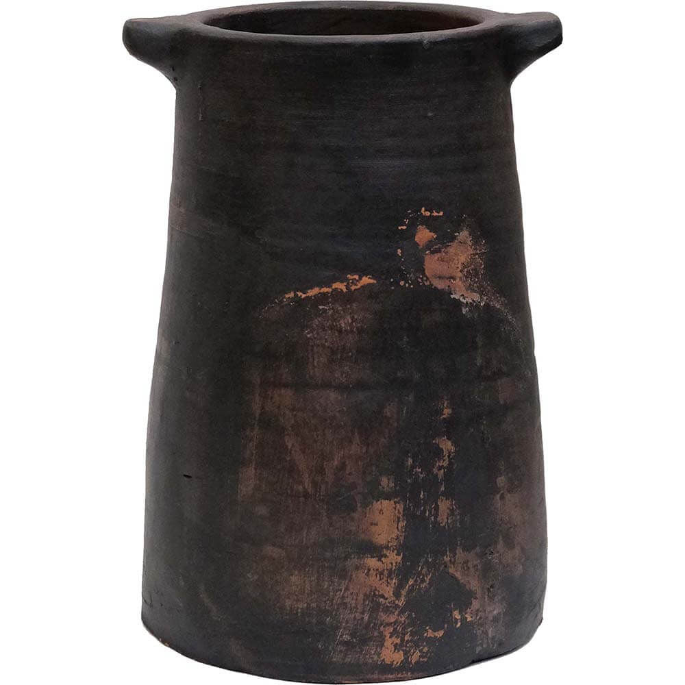 Denne lerkrukke er håndlavet med et rustikt og slidt patineret look, der giver den et autentisk og tidløst udtryk. Krukkens cylindriske form og små håndtag i toppen skaber en traditionel facon, som minder om historisk keramik. De mørke og jordnære farver på overfladen, der varierer fra sort til brune nuancer, giver krukken et vintage-look. Brug den til grydeskeer i dit køkken, til en grøn plante eller bare som den er. Krukken vil helt sikkert tilføje charme og karakter til enhver indretning, hvor du ønsker et autentisk islæt. Krukken er ikke vandtæt, så husk at bruge et plastik indlæg eller lignende, hvis den bruges til planter. Krukken har en matchende lillesøster. Søg efter Tulle i søgefeltet.
