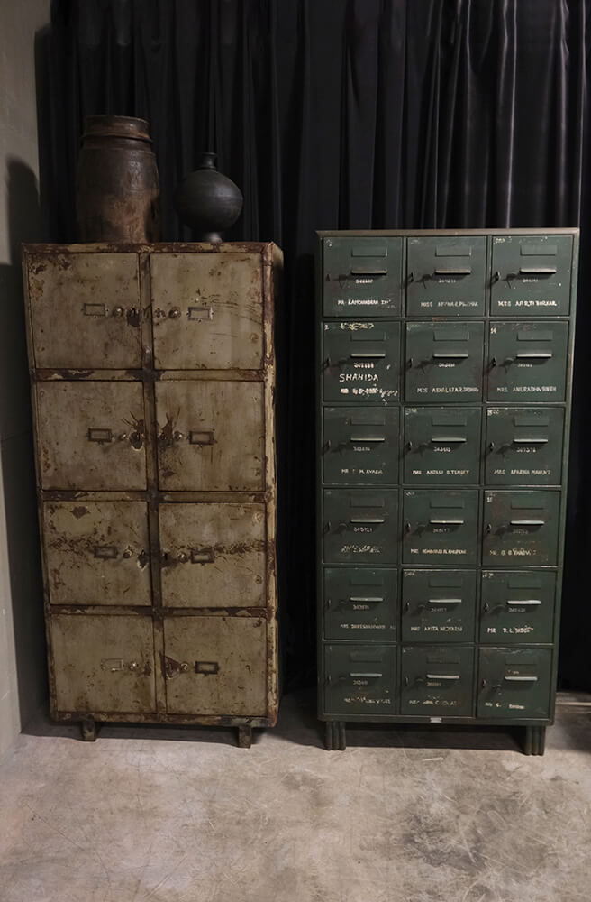 Unikt gammelt locker jernskab med et selvsikkert råt og maskulint look. Dette skab med en unik finish vil helt sikkert tilføre ekstra kant til din indretning. Jernskabet har 18 rum, og kan bruges til opbevaring af alt fra sko til huer og andre accessoires. Her får du et smukt stort skab med en lang historie og et tidligere liv i Fjernøsten. Skabene har forskellige numre, da de er fra et større parti. Patinaen og numrene kan derfor afvige fra billedet.