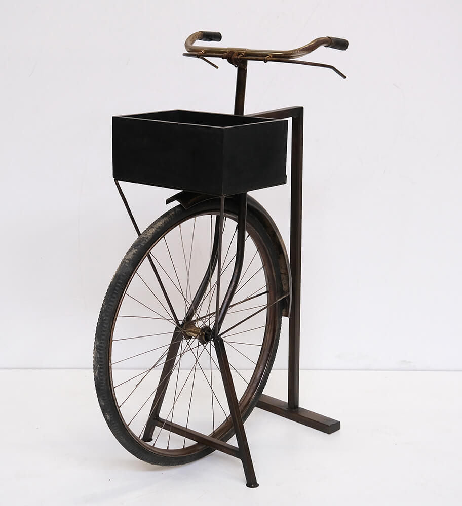 Skøn og sjov eyecatcher, der er lavet af fronten af en gammel cykel. Den gamle immobile cykel har den skønneste patina og er blevet tryllet om til en gulvstander med en sortmalet kasse foran, som f.eks. kan bruges til menukort i en restaurant, brochurer i din butik eller til vandflasker til et event. Du kan selvfølgelig også bare bruge den som blikfang som den er eller stylet med f.eks. grønne planter.
