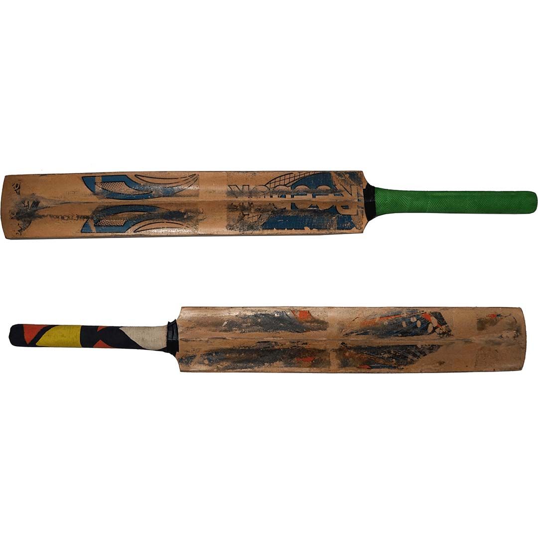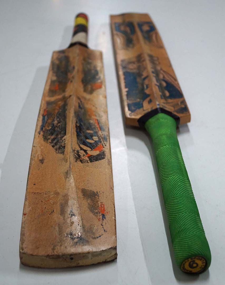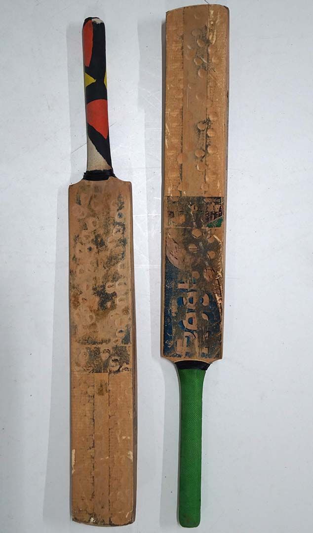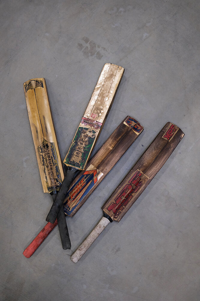 Gamle cricket bat i træ med forskellige print. Alle bats er forskellinge både i størrelsen og udtryk. Cricket spilles verden over, men er i særdeleshed en populær sportsgren i Indien.