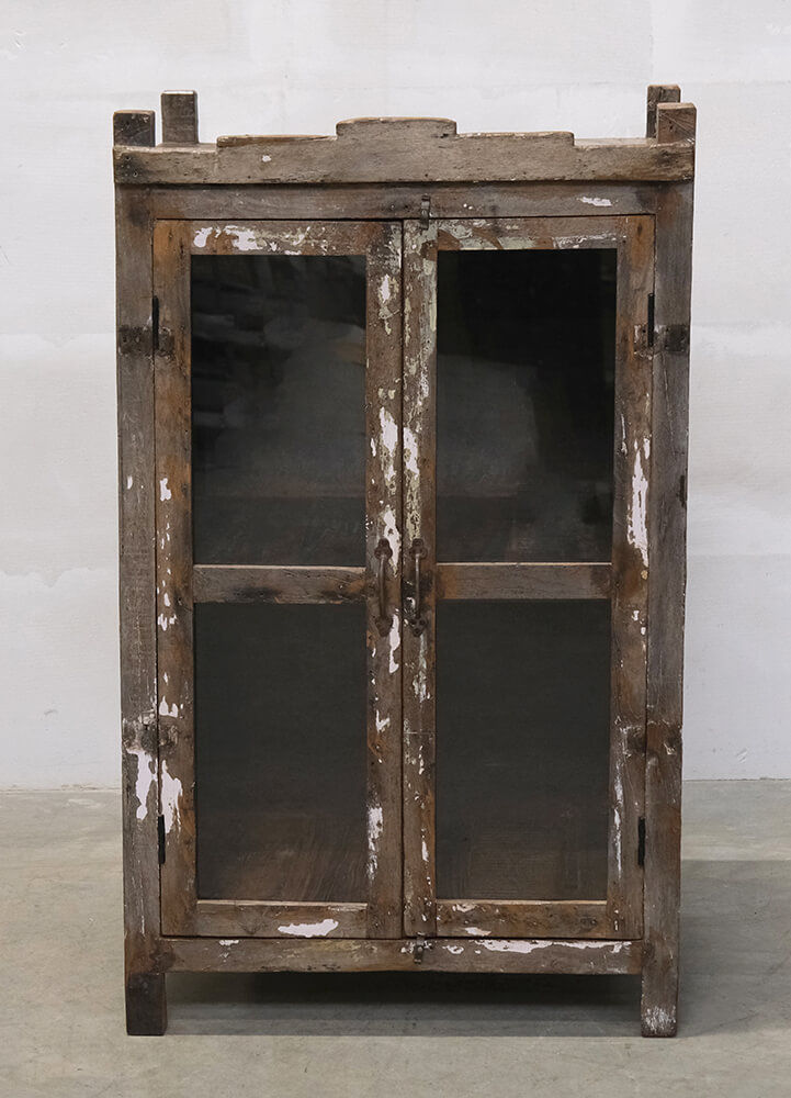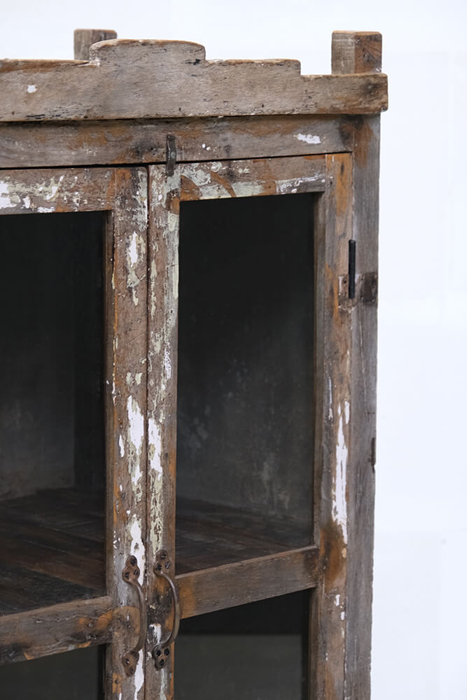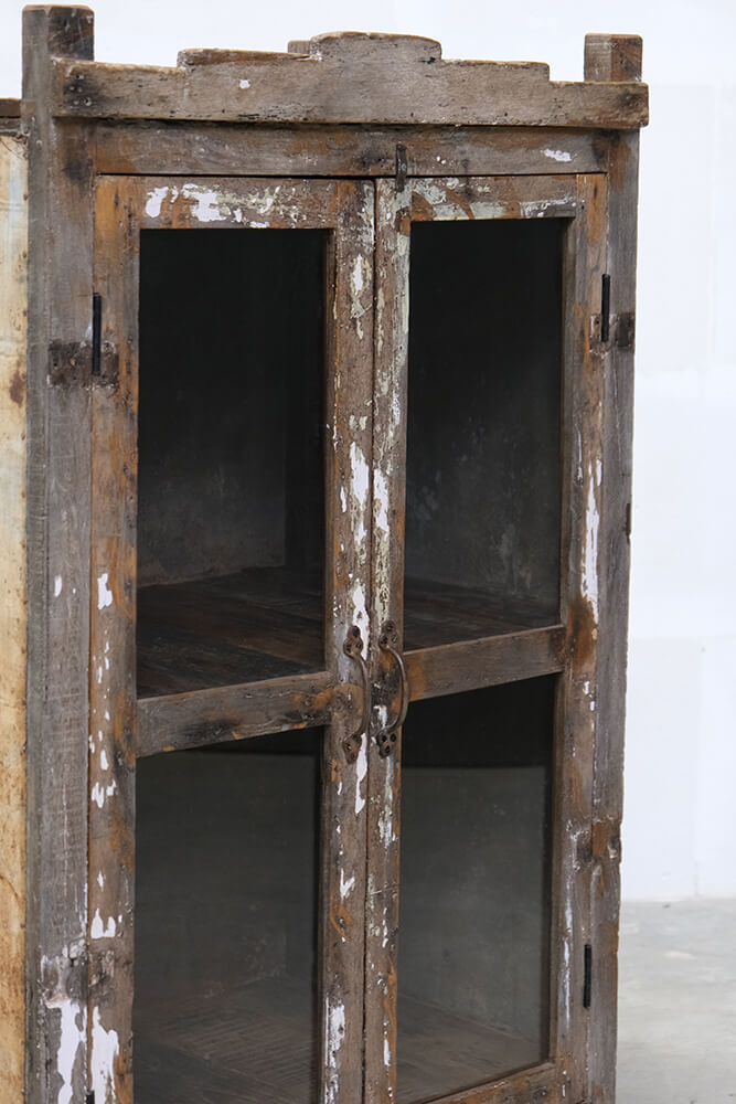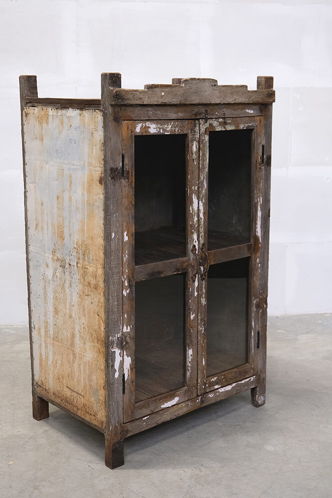 Dette vitrineskab med metalbeklædning, udstråler en rå og industriel charme. Skabet har to glaslåger, der åbner op til to rummelige hylder, perfekt til opbevaring og præsentation af dine yndlingsgenstande. Den slidte metaloverflade kombineret med det patinerede træ giver skabet et autentisk vintage-look, der tilfører karakter til din indretning. Brug det i en butik til at fremvise varer, i køkkenet til porcelæn, eller i stuen til bøger og dekorationer. Et møbel med sjæl og historie, der skiller sig ud fra mængden.