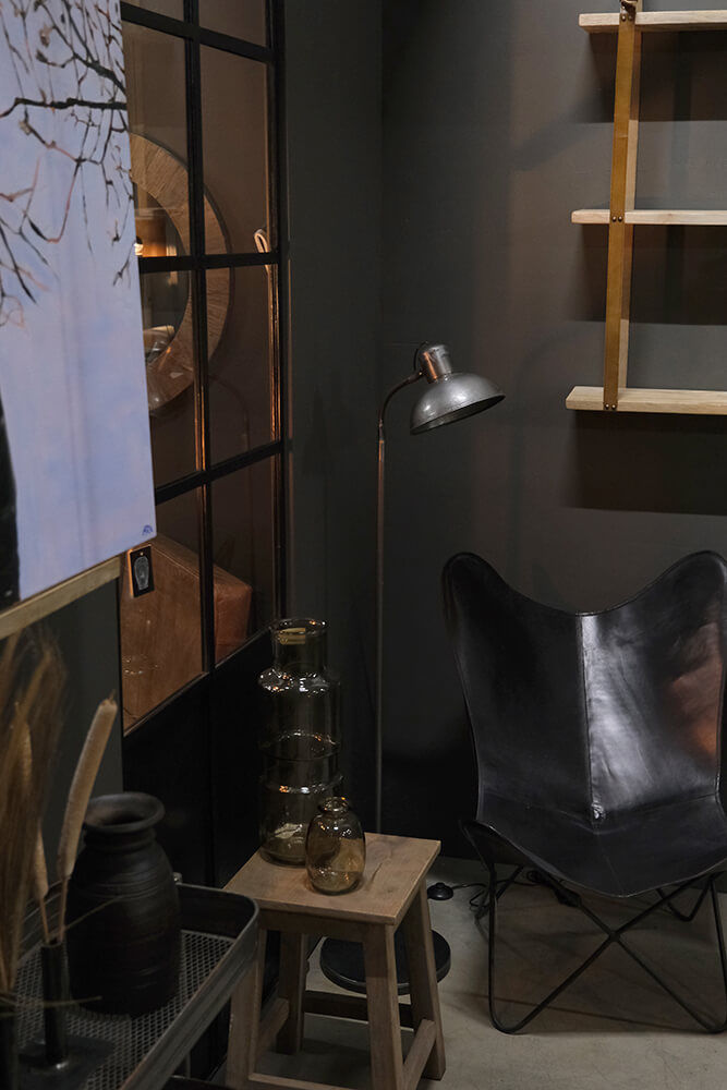 Denne klassiske model af en gulvlampe fremstillet i jern, består af få konstruktioner, der forbinder hinanden. Gulvlampen har en solid rund fod, der danner basen for en tynd stamme, som møder et fleksibelt topstykke der er forbundet med en lille lampeskærm. Denne gulvlampe passer perfekt ind i den rå, klassiske eller simple indretning.