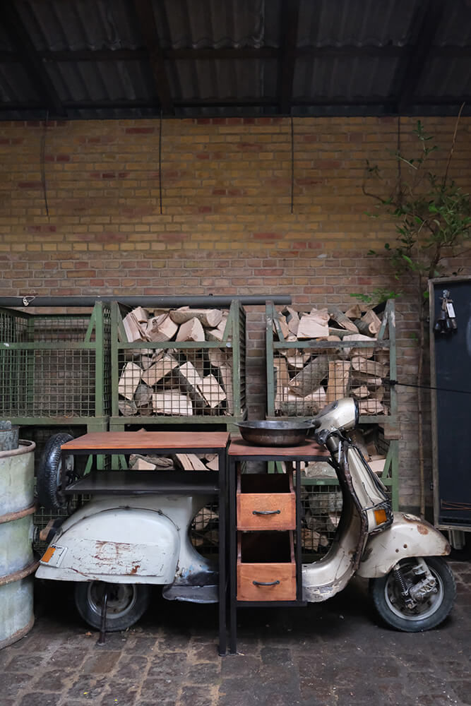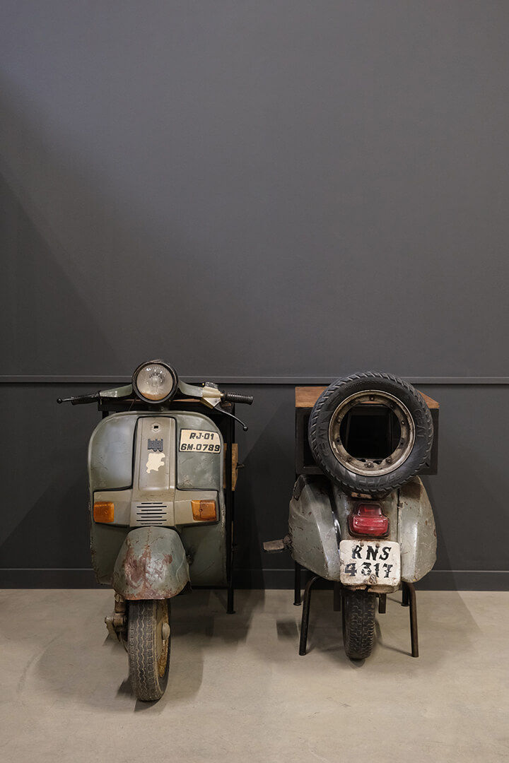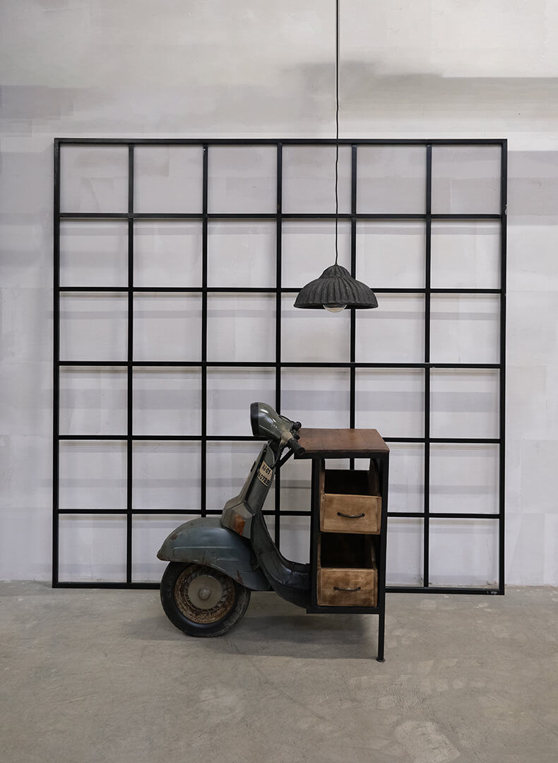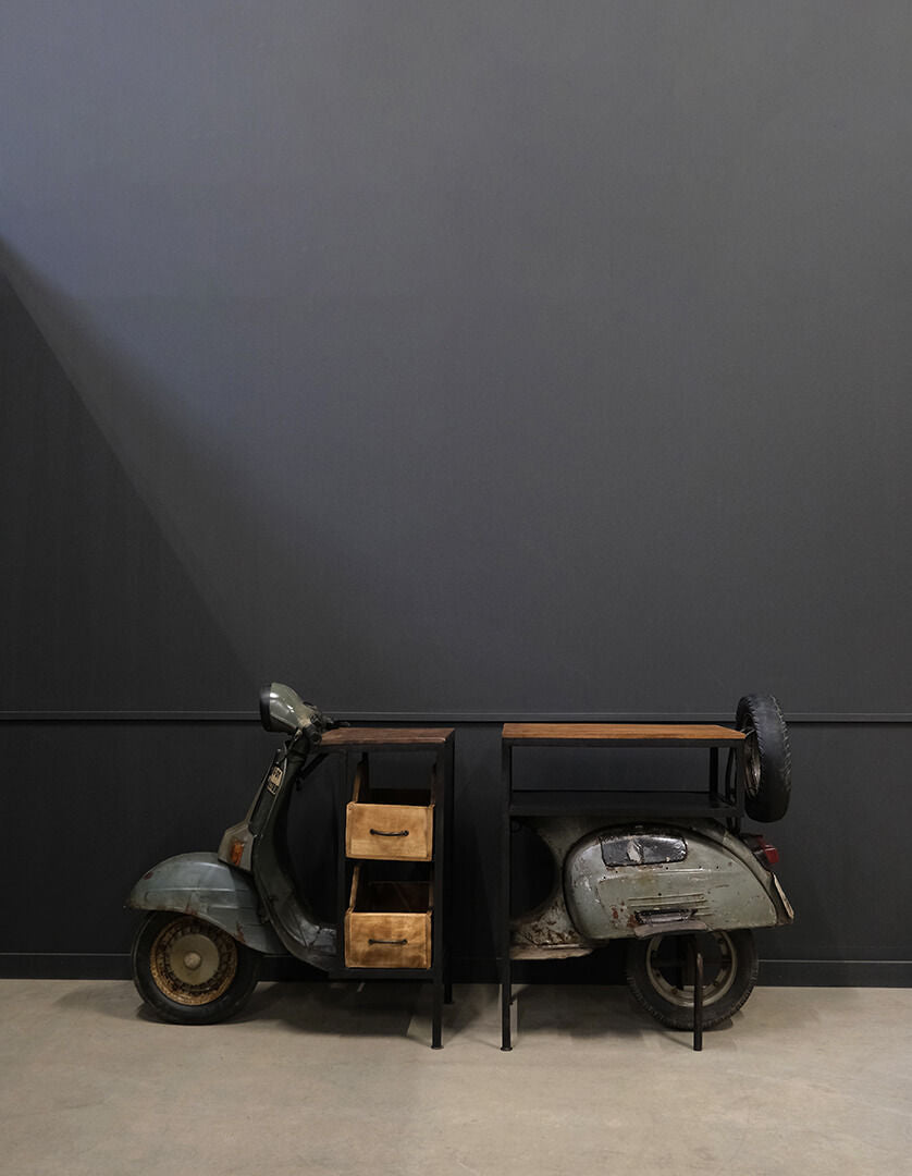 Er du også vild med denne sjove scooterfront med 2 skuffer? Da fronten af møblet er lavet af gamle brugte scootere i Indien, varierer produktet, og ikke to er ens. De 2 kraftige skuffer med hank kan åbnes fra begge sider. Skufferne og bordpladen er lavet i genbrugstræ. Disken kan bruges i din bar eller din butik som et skønt blikfang, eller i privaten hvor den helt sikkert vil skabe opmærksomhed.