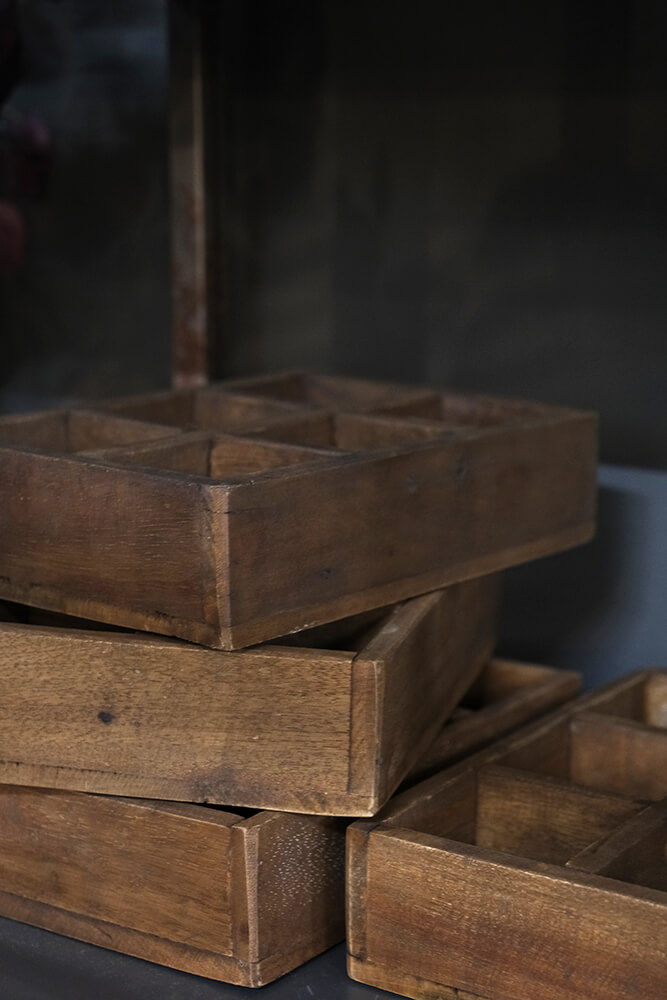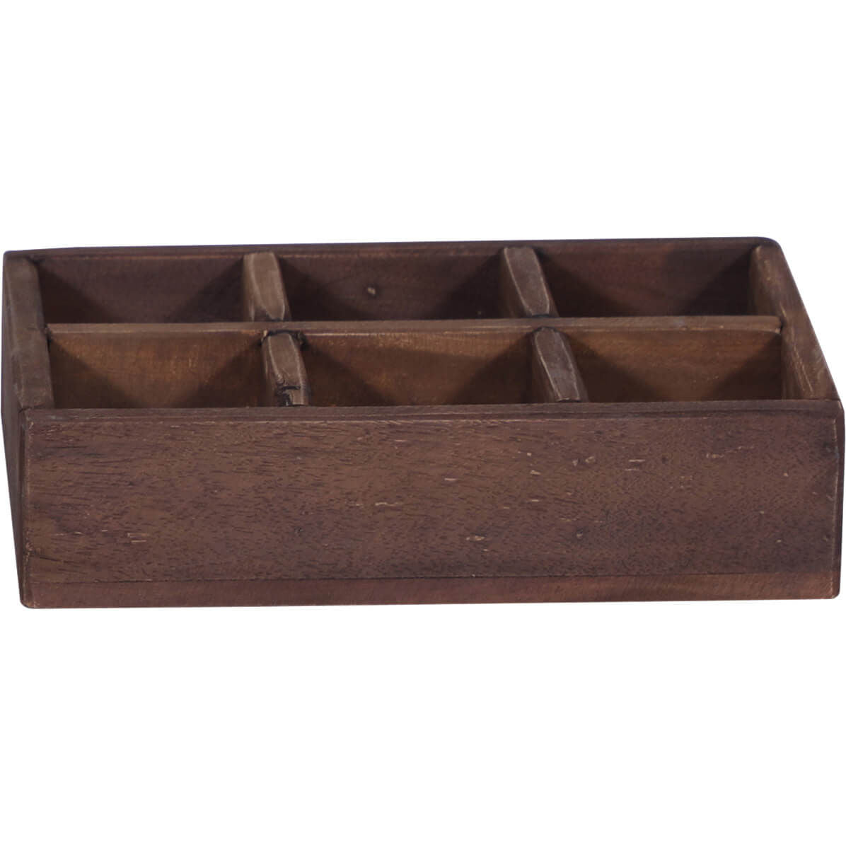 Denne lille træboks med 6 rum er helt perfekt til opbevaring af småting. Den har en fin størrelse, der gør den ideel til at organisere smykker, nøgler, kontorartikler og meget mere. Den lækre brune farve tilføjer varme og charme til enhver indretning. Hold dine små ejendele pænt organiseret med denne praktiske og stilfulde træboks.